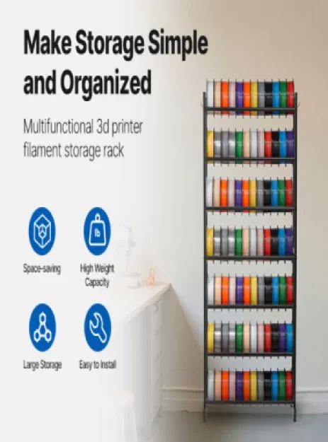 Dieses Filament-Lagerregal besteht aus Kohlenstoffstahl mit hochwertiger Pulverbeschichtung und zeichnet sich durch ein sicheres Design mit glatten Kanten aus. Es ist robust, langlebig und für den Langzeitgebrauch konzipiert.