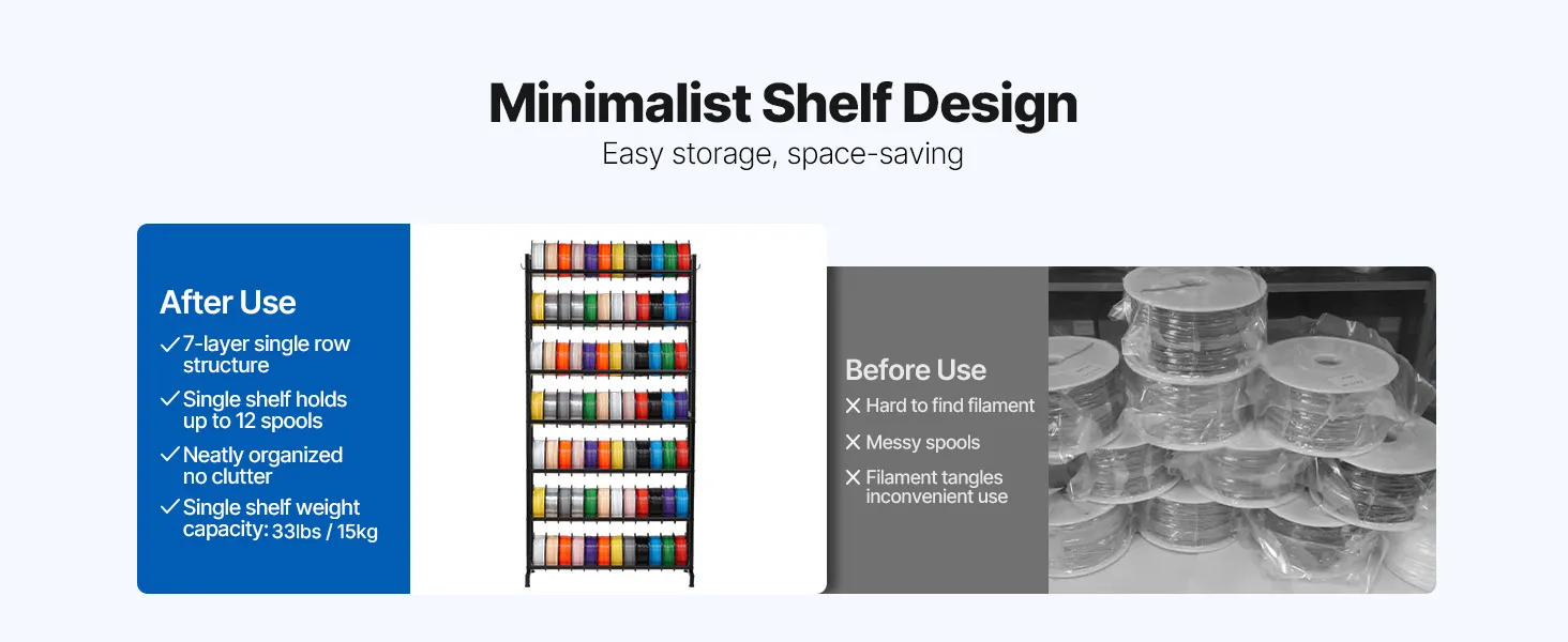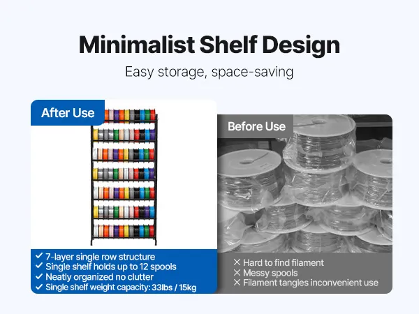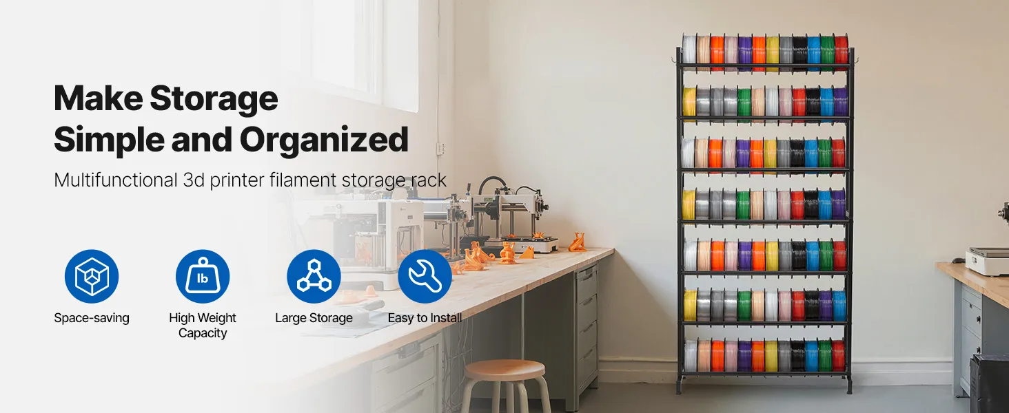 Hohe Tragkraft: Dieses Filamentregal trägt 54,4 kg pro Regal (insgesamt 381 kg) und ist ideal für die Lagerung von 3D-Materialien. Es besteht aus robustem Kohlenstoffstahl und gewährleistet die Sicherheit und Stabilität all Ihrer Materialien.