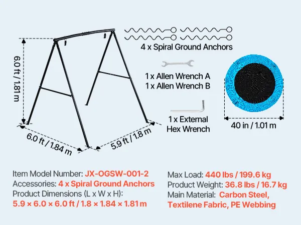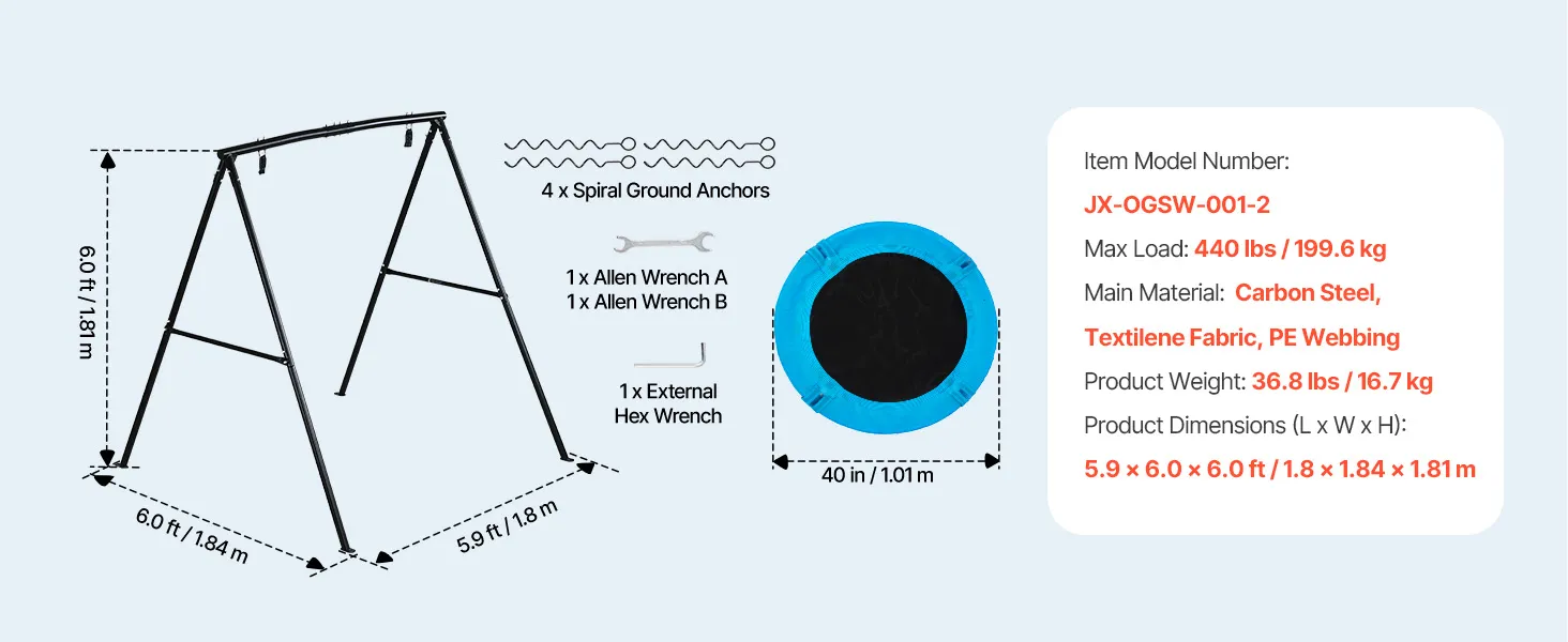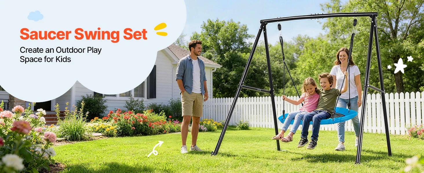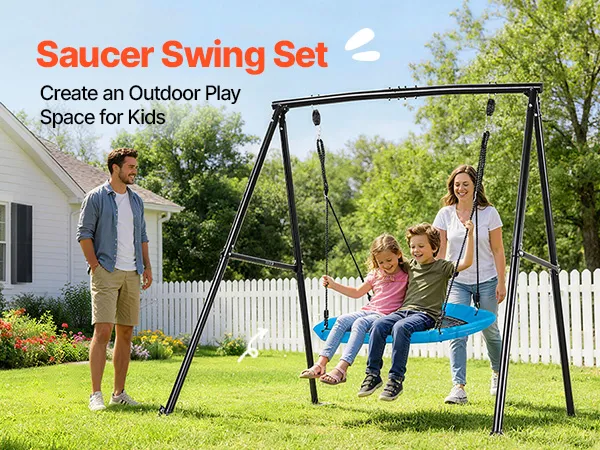VEVOR Gartenschaukel mit A-förmigem Metallgestell, Schaukelsitz (101,6 cm Groß), bis zu 199,6 kg Tragkraft, Schaukelset Outdoor, Verstärkt mit Spiralförmigen Bodenankern, Tellerschaukel Schwarz Blau
