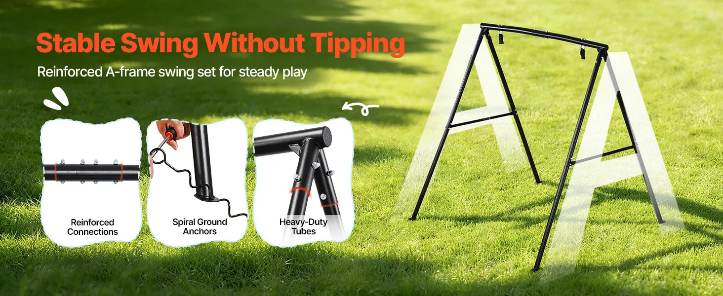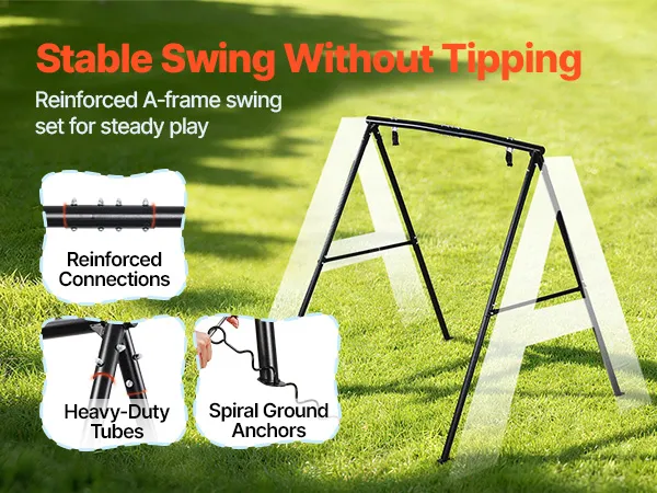 Der A-förmige Stahlrahmen mit verstärkten Hülsen bildet eine robuste und stabile Dreieckskonstruktion. Hochbelastbare Rohrverbindungen tragen zur Gesamtstabilität der Schaukel bei, während spiralförmige Bodenanker den Rahmen fest im Boden verankern und Bewegungen beim Schaukeln reduzieren.