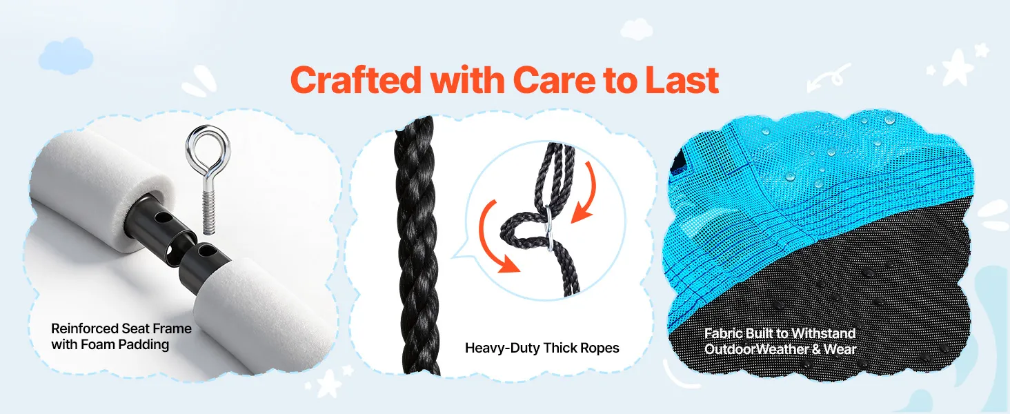 Ein verstärkter Sitzrahmen mit Schaumstoffpolsterung bietet hohe Stabilität und Komfort. Der Sitzbezug ist strapazierfähig und farbecht. Robuste, verstellbare Seile sorgen für einen stabilen Halt der Schaukel mit Gestell.