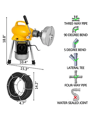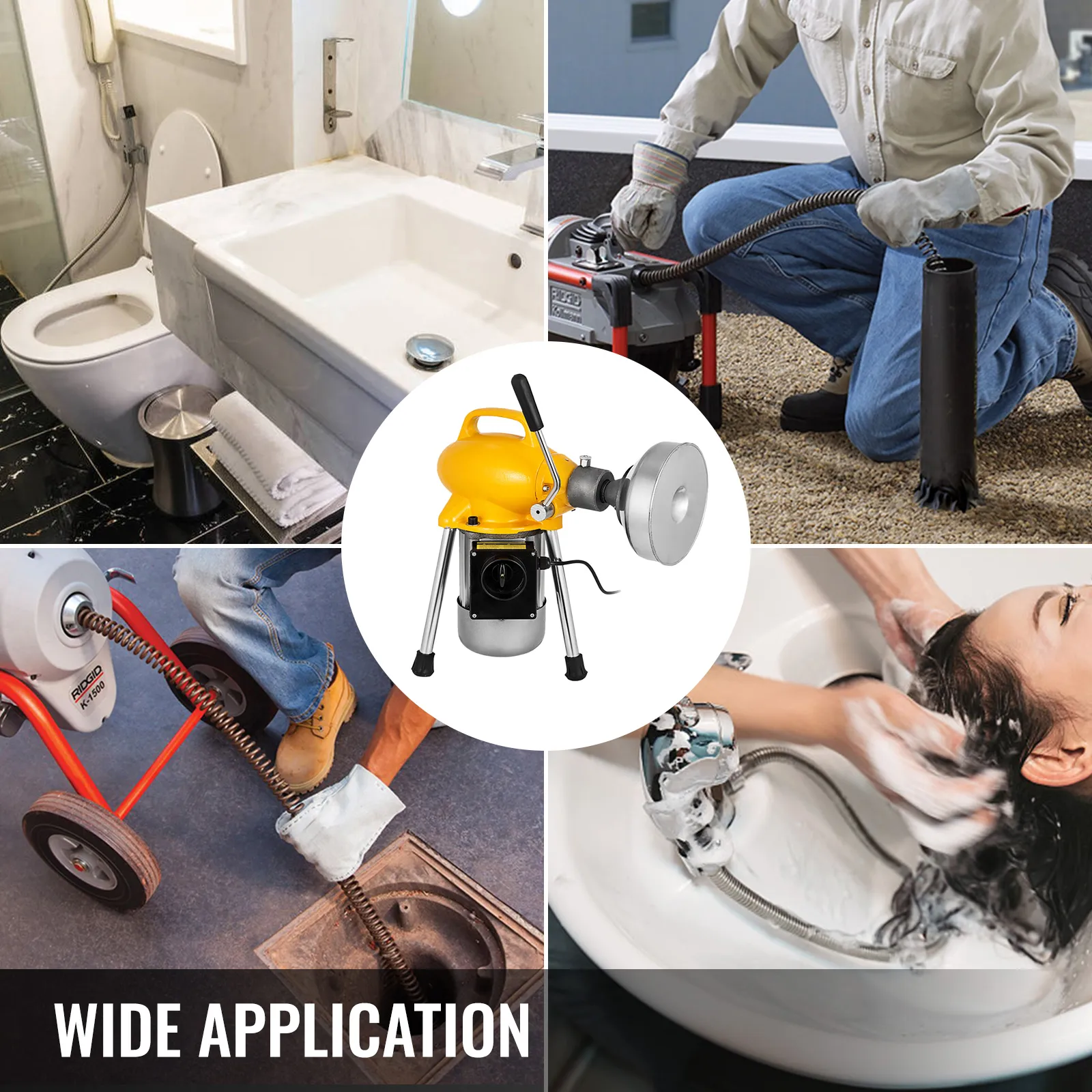 Wir bieten Ihnen eine überlegene Reinigungsmaschine mit einer Reinigungsgeschwindigkeit von 400 U/min und einem Reinigungsrohrdurchmesser von 20 bis 100 mm (0,8-4,0 Zoll). Es ist für Waschbecken, Duschen und Bodenabläufe geeignet. Diese kompakte und vielseitige Maschine ist für gewerbliche oder private Anwendungen konzipiert. Das Paket enthält Adapter, Kabel und eine Auswahl an Schneidern und Schnecken. Es ist zu Hause, im Büro und an öffentlichen Orten überall dort anwendbar, wo eine Rohrreinigung erforderlich ist.