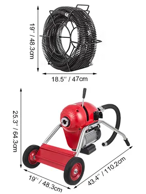 Dies ist eine Abflussreinigungsmaschine für 2-Zoll- bis 8-Zoll-Rohre, die bis zu 60 Meter Kabel antreibt. Zwei Vollgummiräder an der Haupteinheit erleichtern den Transport. Die Maschine enthält sechs Schneidwerkzeuge und einen Schlüssel (austauschbare Bits und Kabel sind für die Abflussreinigungsmaschine von Rigid geeignet) sowie 16 Meter (4 Stück x 4 Meter) 30-mm-Kabel.