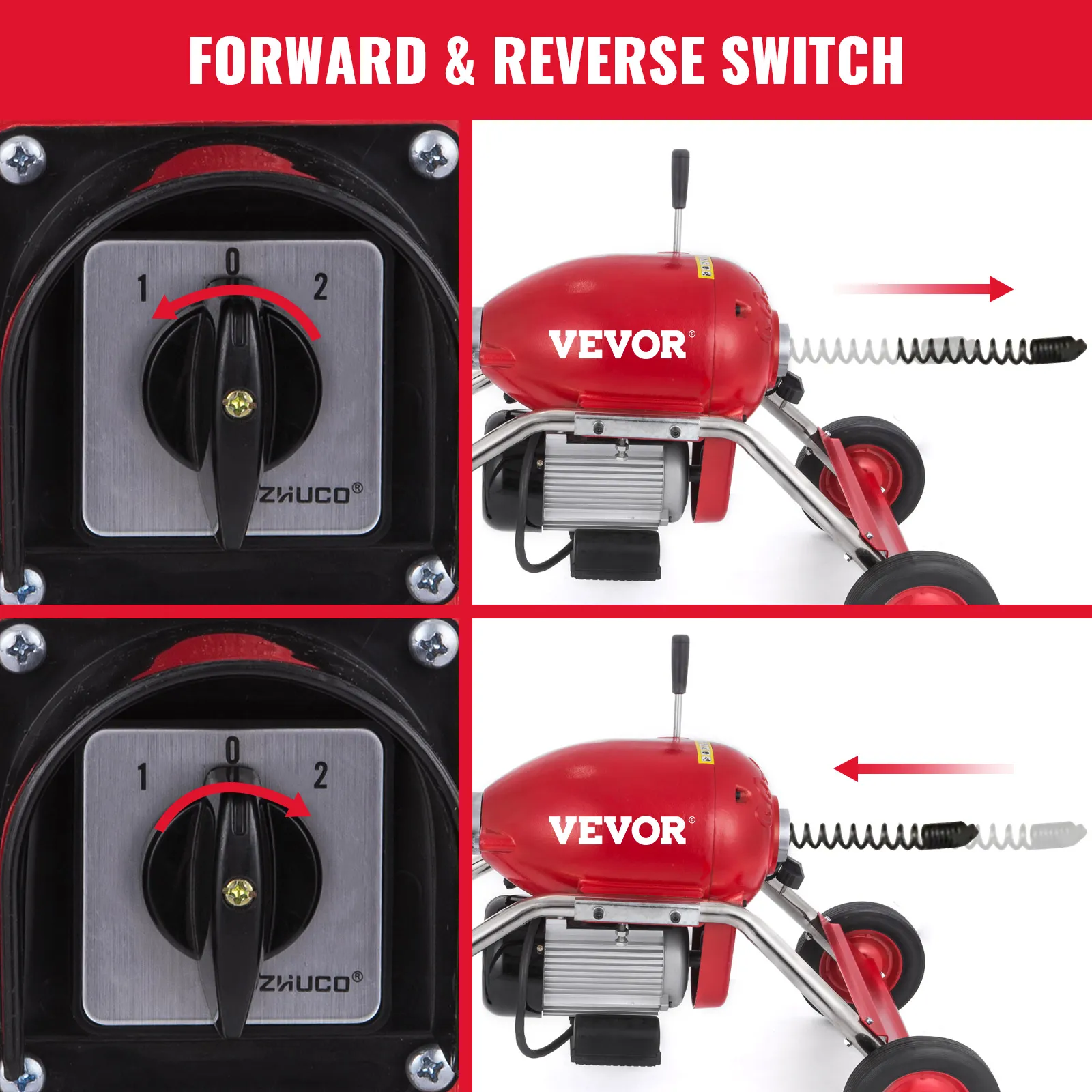 • 【EINFACH BENUTZUNG】 - Eine Taste zum Ändern der Richtung. Kunststoff-Silberschmelzkontaktschalter. Die Kanalreinigungsmaschine ist einfach zu bedienen, sicherer und langlebiger für Sie.