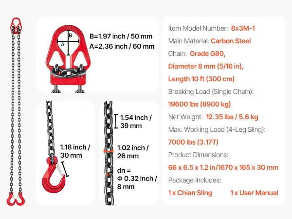 3,17 T Hohe Tragfähigkeit: Mit einer maximalen Arbeitslast von 3,17 T bietet diese Hochleistungs-Kettengehänge zuverlässige Hubkraft für Industrie- und Bauaufgaben