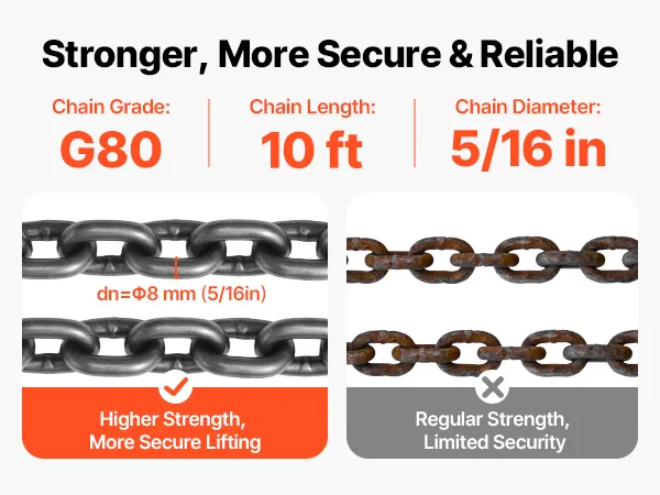 Premium G80-Kette mit: Hergestellt aus legiertem Stahl der Güteklasse 80 mit einem Kettendurchmesser von 8 mm (5/16 Zoll) und einer Gesamtlänge von 3 m. Die Anschlagkette mit Haken gewährleistet hohe Festigkeit und Flexibilität für unterschiedliche Hebeanforderungen
