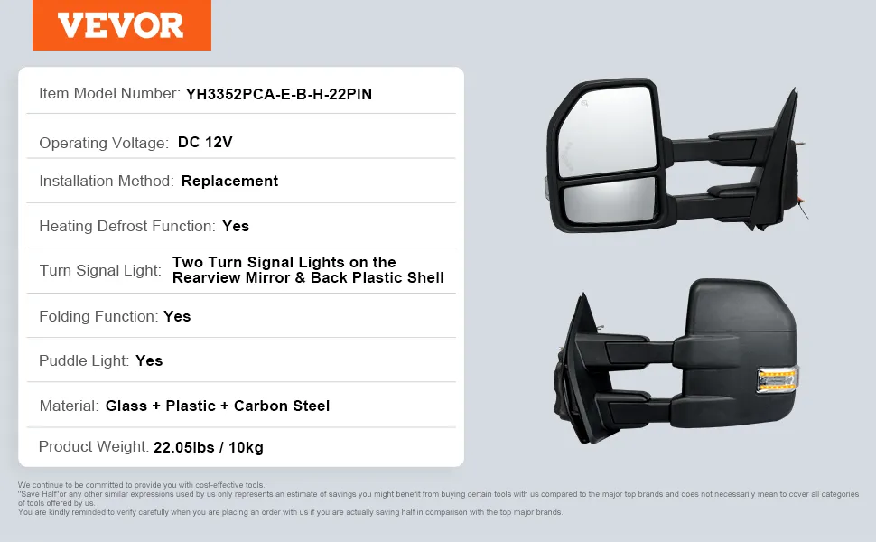 Die VEVOR-Abschleppspiegel für den Ford F150 bieten hervorragende Sicht. Das Design passt für Ford F150-Modelle von 2015 bis 2018. Diese Spiegel bieten eine breitere Sicht, die für das Abschleppen unerlässlich ist. Sie sind sowohl mit ebenem als auch mit konvexem Glas für bessere Winkel ausgestattet. Dieses Design hilft Ihnen, beim Fahren mehr zu sehen, was das Abschleppen sicherer macht. Der Spiegel ist außerdem mit Blink- und Pfützenlichtern ausgestattet. Diese Glühbirnen helfen, den Boden bei schlechten Lichtverhältnissen besser auszuleuchten. Die Pfützenlichter sind besonders nachts nützlich. Sie beleuchten den Bereich um Ihr Fahrzeug herum, helfen, Hindernisse zu vermeiden und erleichtern das Einparken. Insgesamt verbessern diese Spiegel sowohl Ihr Fahr- als auch Ihr Abschlepperlebnis.