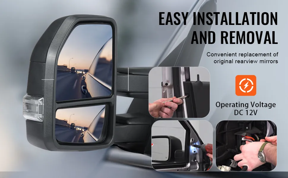 Diese Funktion verbessert die Verkehrssicherheit, indem sie Ihre Blinker besser sichtbar macht und so andere Fahrer auf Ihre Absichten aufmerksam macht und das Unfallrisiko verringert. Die Signallichter sind hell und aus der Ferne sichtbar. Dies ist besonders beim Abschleppen wichtig, da größere Fahrzeuge tote Winkel haben können. Integrierte Signallichter verbessern die Kommunikation mit anderen Autofahrern. Dank dieser Funktion können Sie die VEVOR-Abschleppspiegel für alle Verkehrsteilnehmer weniger gefährlich machen.