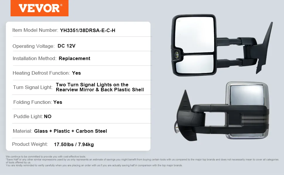 Die VEVOR-Abschleppspiegel verfügen über eingebaute Blinker. Diese Funktion erhöht die Verkehrssicherheit. Das Blinklicht gibt anderen Fahrern klare Hinweise. Es hilft, Unfälle zu vermeiden und die allgemeine Fahrsicherheit zu verbessern. Der Spiegel verfügt außerdem über LED-Fahrlichter, die die Sicht verbessern, insbesondere nachts. Blinker und LED-Fahrlichter arbeiten zusammen, um die Sicherheit zu erhöhen. Diese Funktionen sind wichtig für jeden, der häufig bei schlechten Lichtverhältnissen fährt. Bei der Entwicklung unseres Abschleppspiegels stand die Sicherheit an erster Stelle. Sie machen das Fahren sicherer und bequemer.