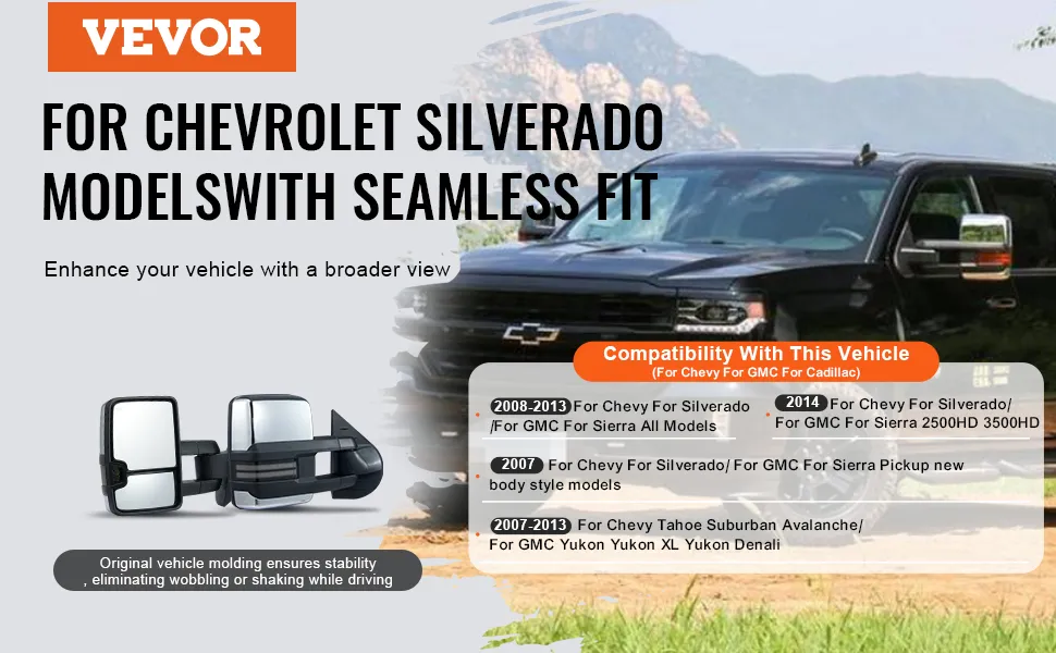 Diese VEVOR-Abschleppspiegel sind für Chevrolet Silverado-Modelle von 2007 bis 2014 hergestellt. Sie verbessern die Sicht und erhöhen die Sicherheit. Diese Spiegel bieten einen Weitwinkelblick. Dies erleichtert die Sicht beim Abschleppen. Der Spiegel ist perfekt für das Fahren in engen Stellen. Diese Spiegel, die für raue Wetterbedingungen ausgelegt sind, erleichtern das Einparken Ihres Fahrzeugs. Diese Spiegel verfügen über Funktionen wie Blinker und LED-Fahrlichter und bieten eine lang anhaltende Leistung. Andere Funktionen wie die Blinkerbeleuchtung machen diese Spiegel für jeden Fahrer zuverlässig. Jeder Fahrer liebt diese Reflexionen, da sie hervorragende Upgrades für jeden Silverado-Truck sind. Sie helfen Ihnen, selbstbewusst und entspannt zu fahren. Alle Abschleppspiegelsätze sind unglaublich nützlich für sicheres Fahren.