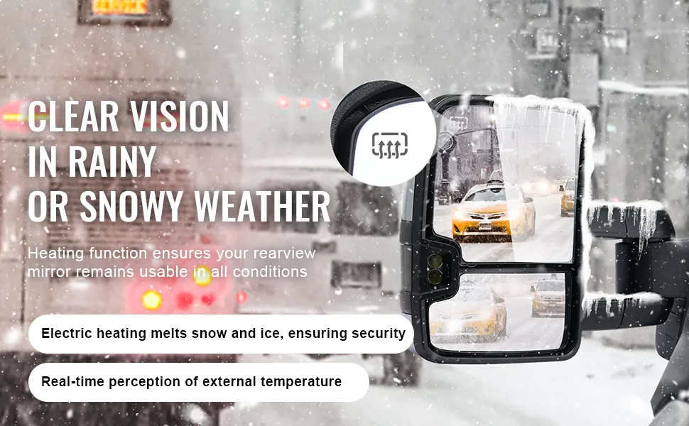 Diese VEVOR-Anhängerspiegel verfügen über eine elektrische Heizfunktion. Diese Funktion sorgt im Winter für schnelles Abtauen. Der beheizte Spiegel verhindert Beschlagen und Frostbildung. Er sorgt für klare Sicht während der Fahrt. Die Heizfunktion ist besonders bei kaltem Wetter nützlich. Das elektrische Glasdesign ermöglicht Ihnen eine einfache Anpassung des Betrachtungswinkels. So können Sie sehen, was sich hinter Ihrem Fahrzeug befindet. Sie funktionieren auch unter schwierigen Bedingungen gut. Ihr Design gewährleistet jedoch jederzeit eine klare Sicht. Deshalb erfordert sicheres Fahren in den Wintermonaten beheizte Spiegel.