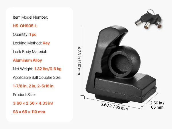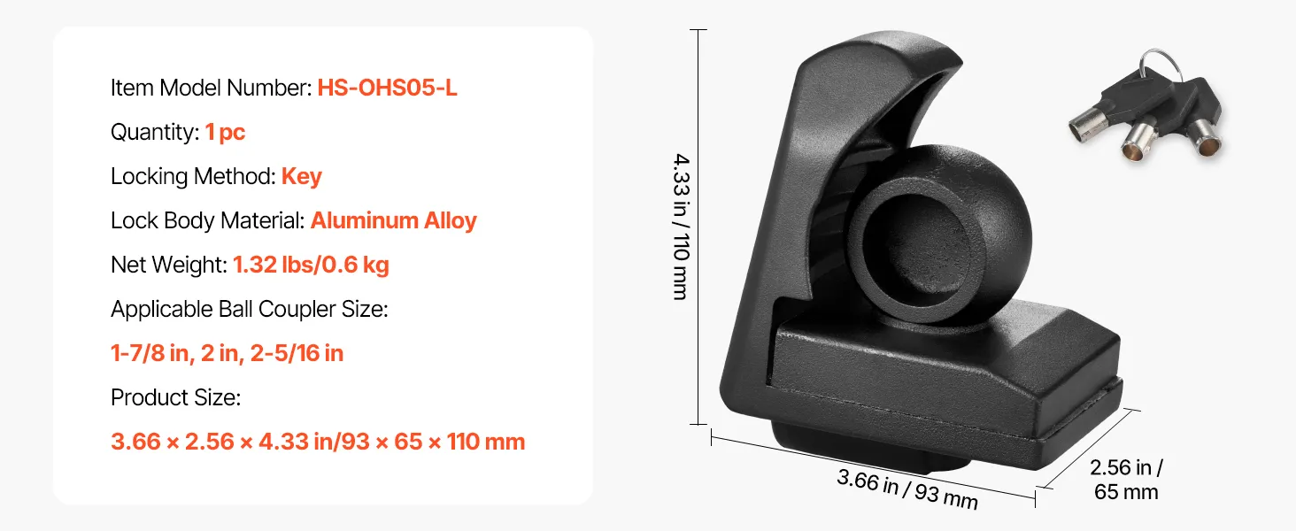 • Universalgröße: Dieses Kugelkopfschloss ist universell passend für 1-7/8, 2 Zoll und 2-5/16 Zoll Kupplungen und erfüllt die Anforderungen verschiedener Anhänger. Bitte überprüfen Sie vor dem Kauf Ihre Kupplungsgröße, um sicherzustellen, dass das Schloss zu Ihrem Anhänger passt.
