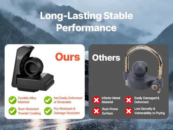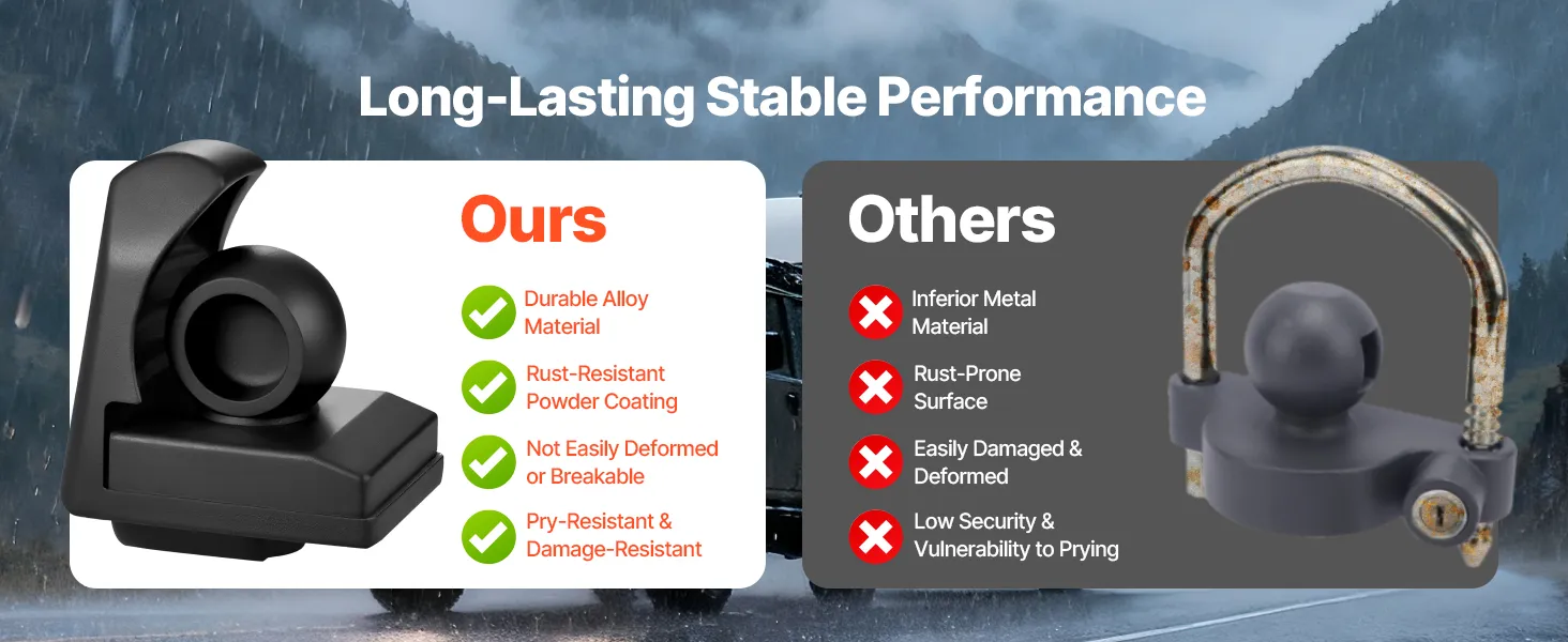 • Rostbeständige Haltbarkeit: Diese Anhängerkupplung mit Kugelkopfverriegelung verfügt über eine pulverbeschichtete Oberfläche mit Rost- und Korrosionsbeständigkeit und hält den Witterungsbedingungen im Freien stand. Sie kann bei sengender Sonne, starkem Regen oder eisigem Schnee eine stabile Leistung aufrechterhalten.