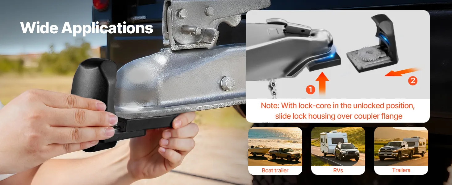 • Breite Anwendung: Dieses Anhängerschloss passt für verschiedene Anhängertypen, darunter Anhänger, Wohnmobile, Geländefahrzeuge und Boote. Ob für Wohnmobil-Camping, Bootsschleppen oder Gütertransport, es bietet eine stabile und zuverlässige Verriegelungsleistung