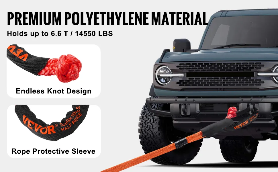 Das synthetische Bergeseil ist ein zuverlässiger Abschleppbegleiter. Es funktioniert gut in allen Abschleppsituationen. Es bietet zuverlässige Leistung, egal ob Sie ein Auto, einen LKW oder ein anderes Fahrzeug abschleppen. Die hohe Bruchfestigkeit stellt sicher, dass das Seil schwere Lasten bewältigen kann. Seine robuste Konstruktion garantiert lang anhaltende Leistung und ist für jeden Fahrzeugbesitzer oder Offroad-Enthusiasten empfehlenswert.