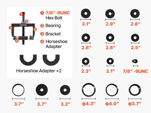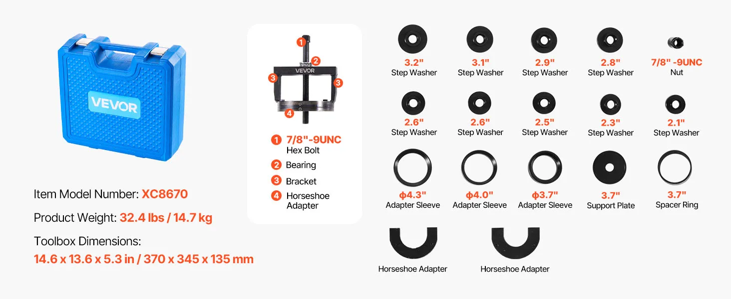 Mehrere Hülsen & Unterlegscheiben: Der Nabenlagerabzieher verfügt über neun Stufenunterlegscheiben (Φ3,2 Zoll, Φ3,1 Zoll, Φ2,9 Zoll, Φ2,8 Zoll, Φ2,6 Zoll x 2, Φ2,5 Zoll, Φ2,3 Zoll, Φ2,1 Zoll) und drei Adapterhülsen (Φ4,3 Zoll, Φ4,0 Zoll, Φ3,7 Zoll) – passend für gängige Naben- und Lagergrößen