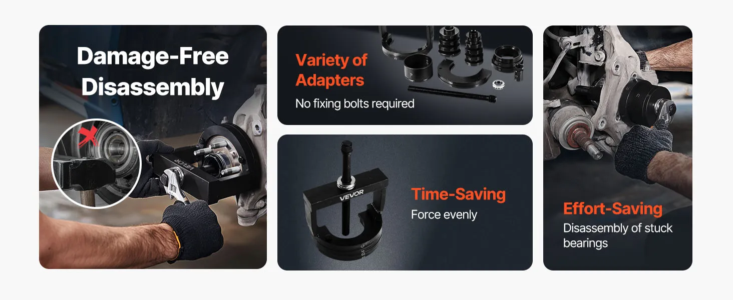 Unser Lagernaben-Demontagewerkzeug passt für die meisten inländischen, europäischen und asiatischen Fahrzeuge mit Frontantrieb. Es ist sowohl für Vorder- als auch für Hinterradnaben geeignet – ein Muss für Kfz-Profis.