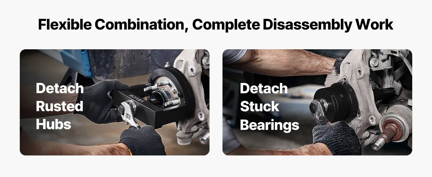 Stützrahmen mit hoher Schubkraft: Ausgestattet mit einer robusten Stützhalterung und Hufeisenadaptern sorgt dieser Werkzeugsatz zum Entfernen der Radlagernabe für eine gleichmäßige Kraftverteilung beim Entfernen der Nabe – wodurch die Belastung der Schraube verringert und die Effizienz verbessert wird