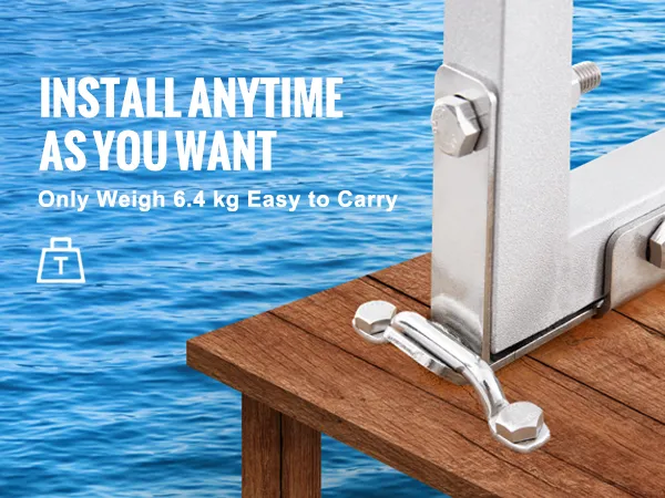 Die abnehmbare Bootsleiter von VEVOR lässt sich einfach und problemlos installieren. Sie wird mit allen notwendigen Teilen für eine sichere Befestigung geliefert. Die Leiter ist abnehmbar, was sie vielseitig einsetzbar macht. Sie können sie nach Bedarf einfach anbringen und abnehmen. Diese Funktion ist praktisch für den Transport oder die Lagerung der Leiter. Aufgrund ihres leichten Designs ist diese Leiter auch für Senioren leicht zu handhaben. Dank des intuitiven Designs benötigen Sie für den Aufbau keine Spezialwerkzeuge oder -kenntnisse. Das macht sie zu einer hervorragenden Ergänzung für jeden Steg oder jedes Boot.