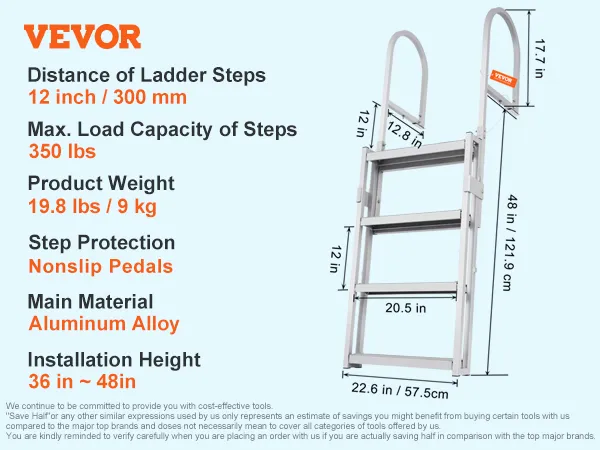 Die VEVOR-Anlegeleiter ist für eine Vielzahl von Benutzern geeignet. Mit einer maximalen Tragfähigkeit von 350 lbs kann die VEVOR-Anlegeleiter eine Vielzahl von Personen aufnehmen. Diese hohe Tragfähigkeit stellt sicher, dass die Leiter schwerere Personen oder solche, die zusätzliche Ausrüstung tragen, tragen kann. Dank der robusten Konstruktion und der hohen Tragfähigkeit ist das Werkzeug für den persönlichen und gewerblichen Gebrauch geeignet. Egal, ob Sie mit Ihrer Familie oder Ihrem Unternehmen arbeiten, diese Leiter bietet zuverlässigen Zugang zum Wasser. Sie hat eine unglaublich hohe Tragfähigkeit, wodurch sie problemlos von vielen verschiedenen Benutzern verwendet werden kann.