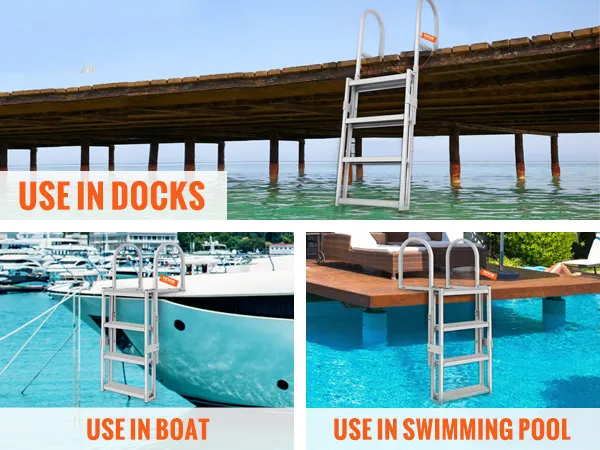 Diese Dockleiter ist vielseitig und kann für verschiedene Zwecke verwendet werden. Sie können sie zum Schwimmen verwenden, da sie eine sichere und mühelose Methode zum Ein- und Aussteigen ins Wasser bietet. Sie ist auch ideal zum Angeln, da sie eine stabile Plattform zum Werfen bietet. Die Leiter macht das Einsteigen in Boote, Kajaks und Paddleboards einfacher und sicherer. Darüber hinaus macht diese Vielseitigkeit sie zu einer unglaublich nützlichen Ergänzung für jede Meeresausrüstung. Egal, ob Sie gemütlich schwimmen, ernsthaft angeln oder Boot fahren, die Leiter funktioniert zuverlässig und effizient und verbessert jede Wasseraktivität.