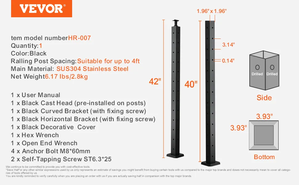 Der vorgebohrte Geländerpfosten von VEVOR erfüllt die Sicherheitsstandards für zuverlässigen Schutz. Er hat einen Kabelabstand von 3,14 Zoll. Dies stellt sicher, dass er den 4-Zoll-Kugeltest besteht. Der Pfosten ist so konzipiert, dass er starken Halt und Sicherheit bietet. Die Sicherheitsmerkmale unseres Pfostens entsprechen den Industriestandards für Geländerpfosten. Dazu gehören die Bereitstellung robuster Unterstützung und sicherer Verwendung. Egal, ob Sie an Projekten im Innen- oder Außenbereich arbeiten, er bietet zuverlässige Sicherheit. Die Einhaltung der Sicherheitsvorschriften stellt sicher, dass dieser Pfosten Ihren Anforderungen entspricht. Er ist die zuverlässigste Wahl für Sicherheit und Unterstützung in jeder Umgebung.