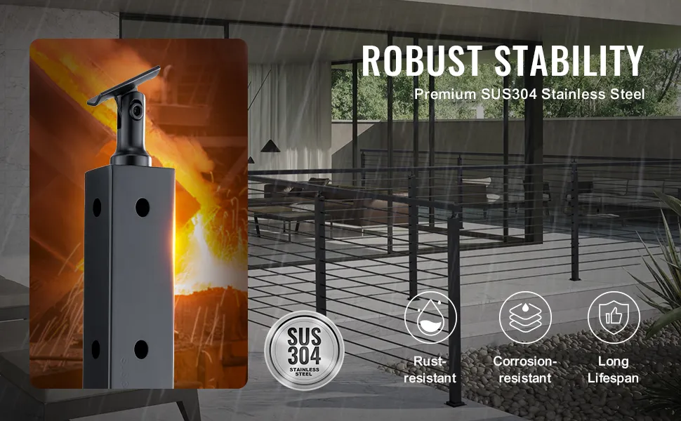 Der VEVOR-Kabelgeländerpfosten ist aus rostfreiem SUS304-Stahl gefertigt. Dieses Material bietet eine hervorragende Rost- und Korrosionsbeständigkeit. Der Pfosten ist auf eine lange Lebensdauer ausgelegt. Er ist ideal für verschiedene Anwendungen im Innen- und Außenbereich. Hochwertiger Stahl stellt sicher, dass der Pfosten unterschiedlichen Wetterbedingungen standhält. Daher ist er für viele Projekte zuverlässig. Langlebigkeit bedeutet weniger Wartung im Laufe der Zeit. Sie können darauf vertrauen, dass er Ihnen lang anhaltenden Halt und Schutz bietet. SUS304-Edelstahl ist für seine Stärke bekannt, weshalb dieser Pfosten als Investition angesehen wird.