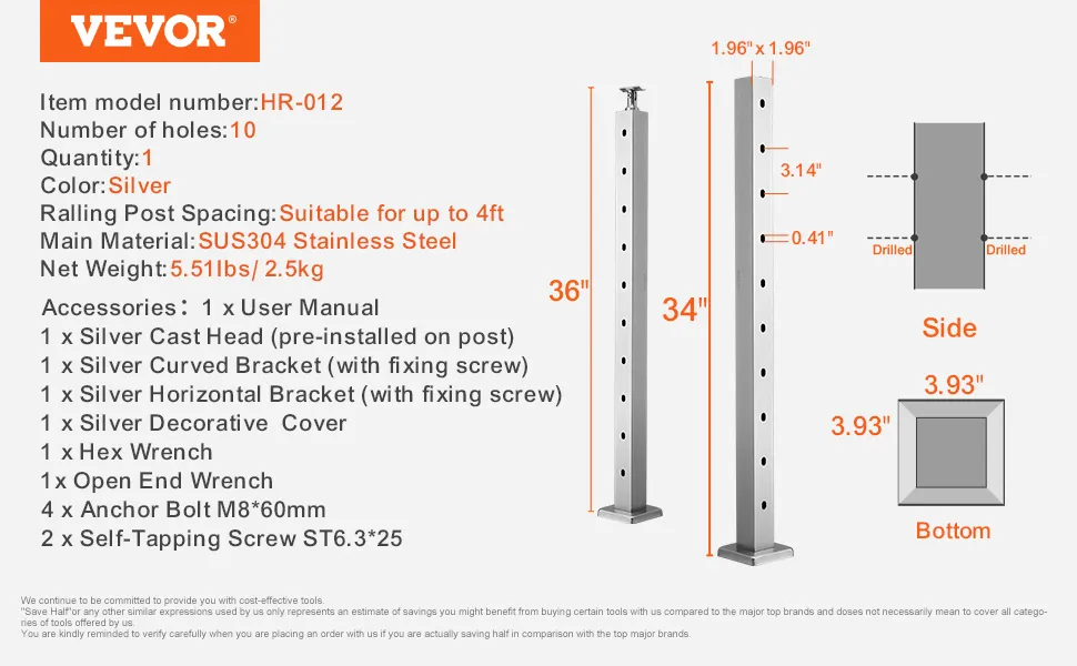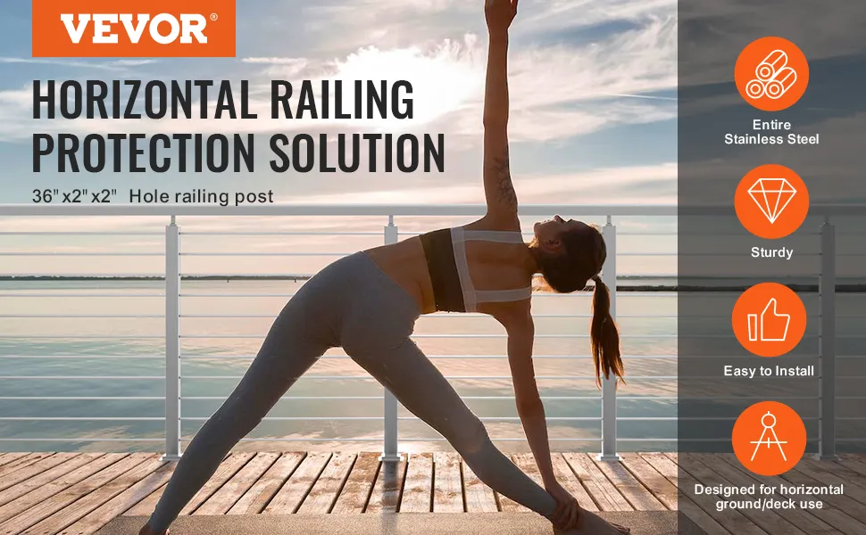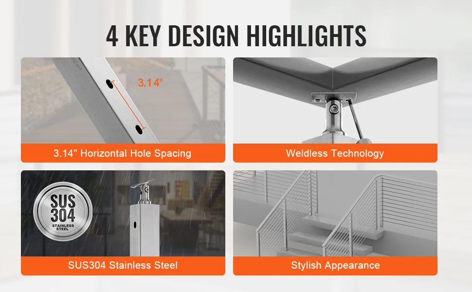Der VEVOR-Kabelgeländerpfosten ist aus hochwertigem SUS304-Edelstahl gefertigt. Dies gewährleistet eine hervorragende Rost- und Korrosionsbeständigkeit. Das Material garantiert eine lange Lebensdauer, auch unter rauen Bedingungen. Daher ist es für verschiedene Anwendungen zuverlässig. Egal, ob Sie es im Innen- oder Außenbereich aufstellen, der Pfosten bleibt stabil. Er kann sowohl in Wohn- als auch in Geschäftsräumen verwendet werden. Seine Robustheit stellt sicher, dass dieser Pfosten auch unterschiedlichen Wetterbedingungen standhält. Das Wissen, dass Ihr Geländersystem robust und langlebig ist, gibt Ihnen Seelenfrieden.
