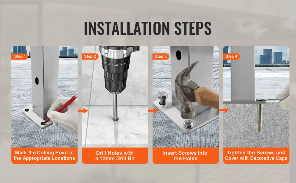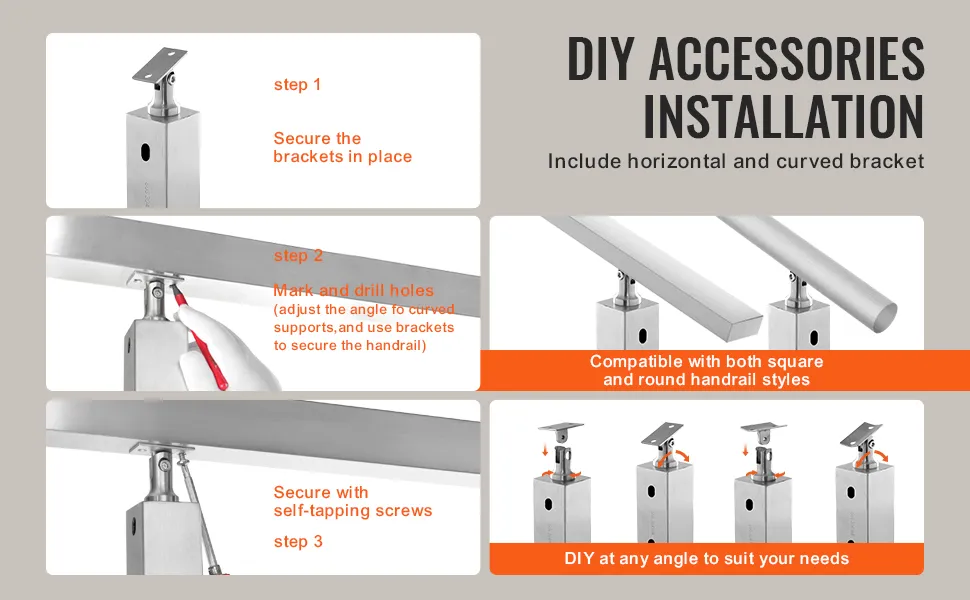 Dieser Geländerpfosten aus Stahl für Terrassengeländer wird mit horizontalen und gebogenen Halterungen geliefert. Diese Funktion erleichtert den Installationsprozess. Die Halterungen sind für verschiedene Lochtypen in Geländerpfosten geeignet. So können Sie jeden Handlaufwinkel selbst anpassen. Die einfache Installation spart Zeit und Mühe. Selbst Personen mit wenig Erfahrung können es problemlos einrichten. Die Einfachheit des Designs gewährleistet eine reibungslose und schnelle Einrichtung. Es ist also die ideale Wahl für alle, die ihr Geländersystem selbst verbessern möchten.