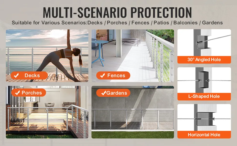 Dieser Kabelgeländerpfosten ist perfekt für verschiedene Anwendungen und verfügt über aluminiumbeschichtete Baluster. Er kann sowohl in Wohn- als auch in Geschäftsumgebungen verwendet werden. Sie können ihn in Häusern, Büros, Hotels und mehr verwenden. Der Pfosten sorgt in jeder Umgebung für Sicherheit und Eleganz. Er ist vielseitig einsetzbar, sodass Sie ihn an jedem Ort aufstellen können. Egal, ob Sie auf einer Terrasse, einer Veranda oder einem Balkon arbeiten, er bietet zuverlässigen Schutz. Aufgrund seiner Anpassungsfähigkeit erfüllt der Pfosten die Anforderungen von Hausbesitzern und Unternehmen gleichermaßen. Dies macht ihn zu einer unglaublich vielseitigen und praktischen Wahl für jedes Geländerprojekt.