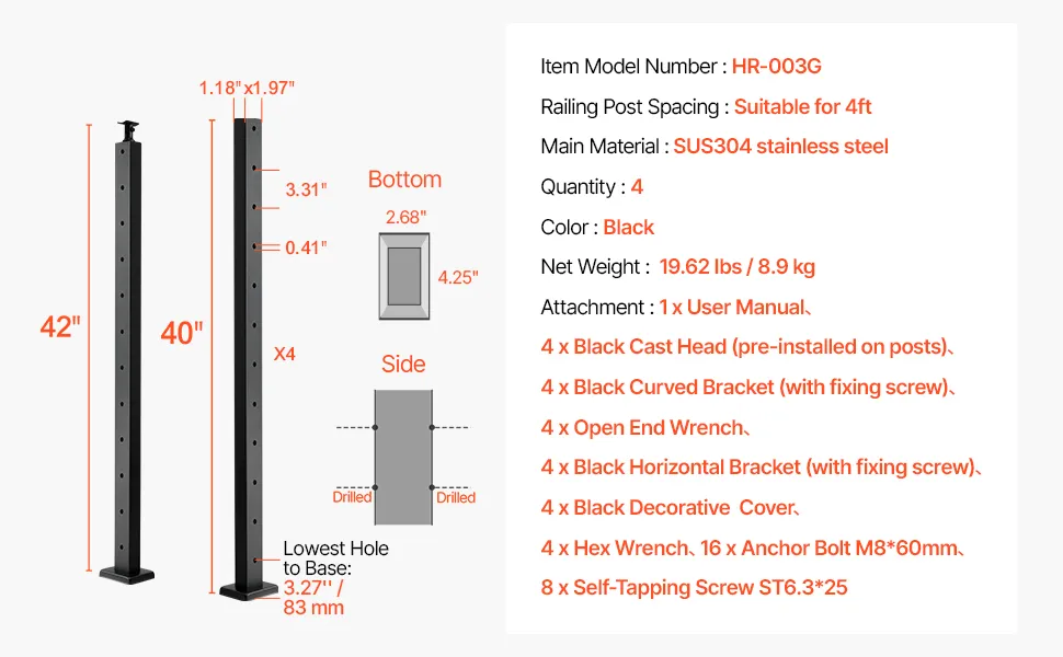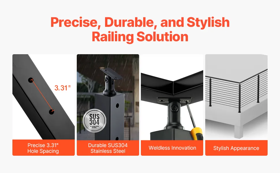 Unser Kabelgeländersystem besteht aus hochwertigem Edelstahl SUS304 und verfügt über einen 3,31 Zoll / 10,41 cm Lochabstand, der den Bauvorschriften entspricht. Es ist nicht geschweißt und hat eine schwarze Oberfläche, wodurch es stilvoll und vielseitig für verschiedene Umgebungen geeignet ist.