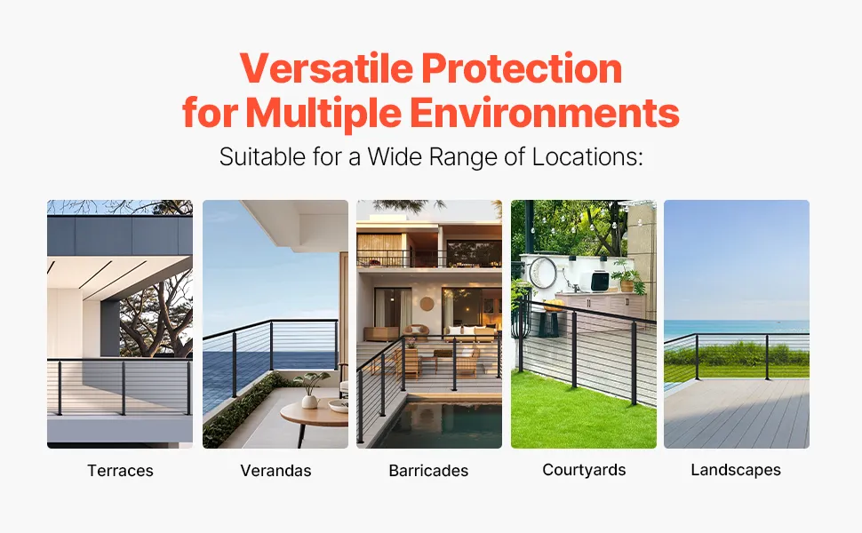 Dieses Terrassengeländer-Set eignet sich für Schutzanwendungen im Innen- und Außenbereich, beispielsweise für Terrassen, Treppen, Veranden, Zäune, Innenhöfe, Balkone, Gärten, Wohngebäude, Bürogebäude, Hotels, Garagen und mehr.