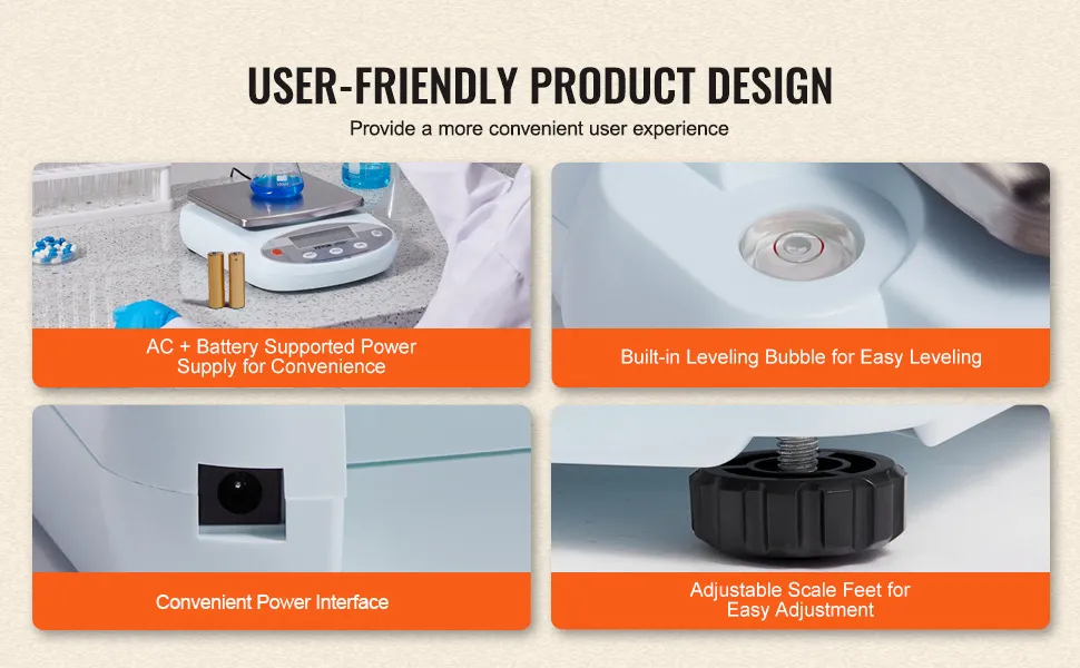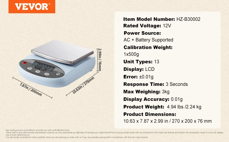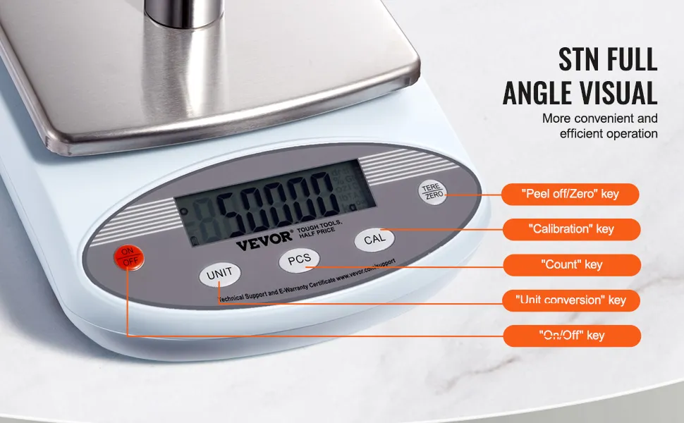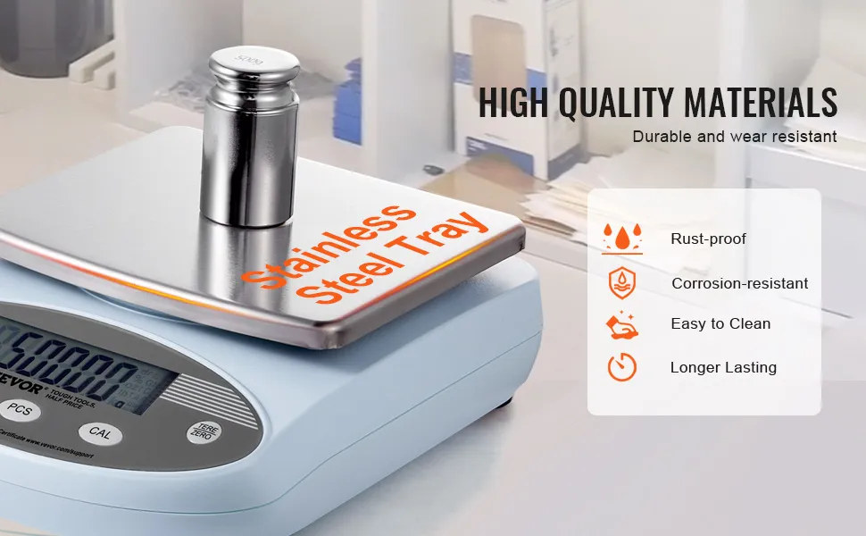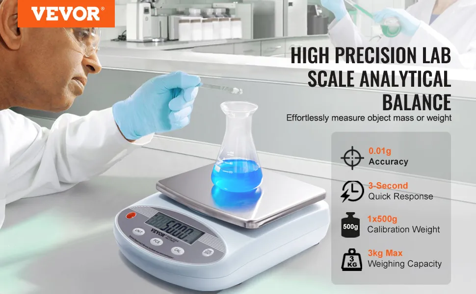Die Laboranalysewaage VEVOR verfügt über hochpräzise Sensoren mit einer schnellen Ansprechzeit von 3 Sekunden und ermöglicht schnelle und genaue Wägungen mit einer Genauigkeit von 0,01 g und einer maximalen Wägekapazität von 3000 g.