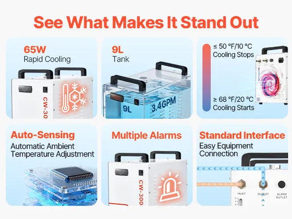 Schnelle Kühlleistung: Steigern Sie die Kühlleistung mit unserem industriellen Wasserkühler. Der integrierte Hochgeschwindigkeitslüfter passt die Drehzahl automatisch an die Wassertemperatur an und trägt so zur optimalen Laserleistung bei. Ideal zur Kühlung von 60-W-Laserröhren