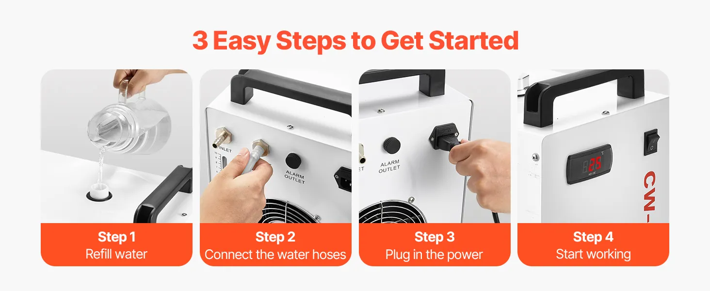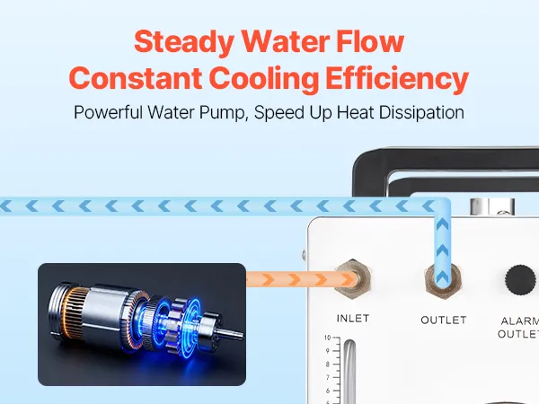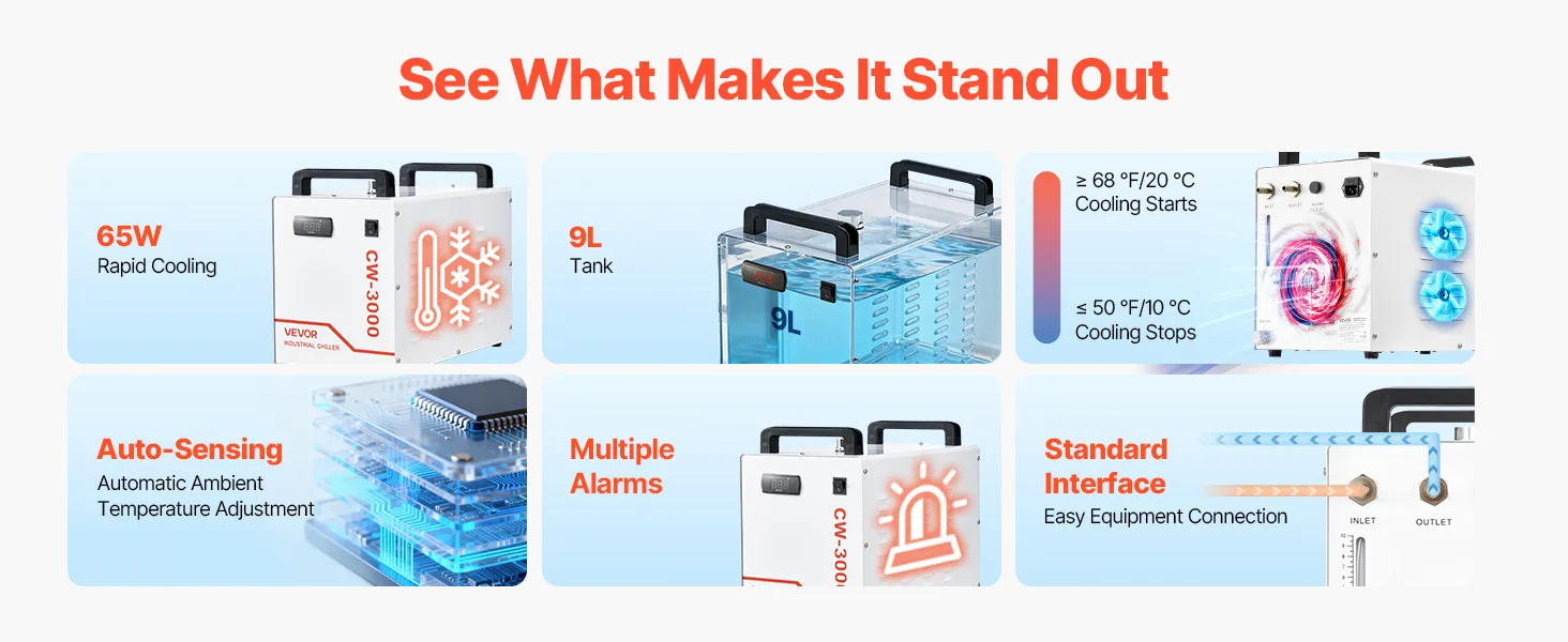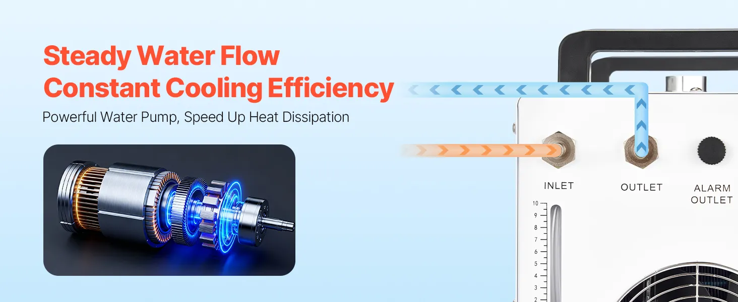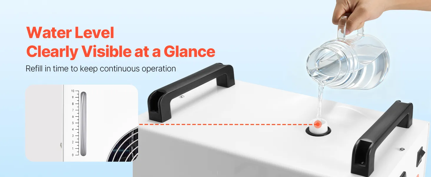 Schnelle Zirkulation, konstante Kühlung: Mit einem 9-L (2,38 Gal)-Tank und einer maximalen Durchflussrate von 10 L/min (2,64 GPM) sorgt dieser Industrie-Wasserkühler für eine schnelle Zirkulation und effiziente Wärmeabfuhr. Dank des Sichtfensters wissen Sie genau, wann Sie Wasser nachfüllen müssen