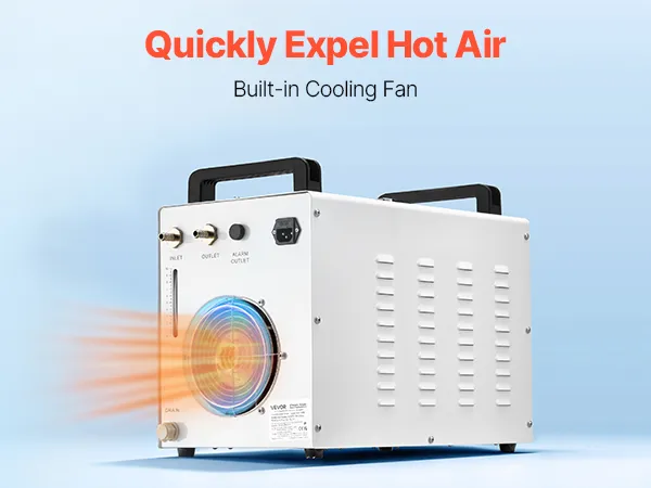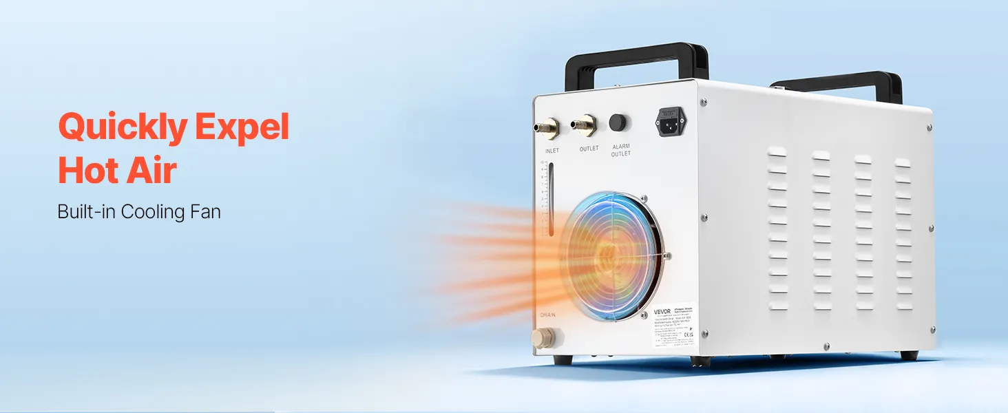 Mit einem effizienten Lüfter und einer leistungsstarken Wasserpumpe sorgt der Wasserkühler für eine schnelle Wasserzirkulation und effektive Wärmeableitung von Lasergravierern und CNC-Maschinen. Mehrere Alarmfunktionen bieten zusätzlichen Schutz. Ideal zur Kühlung von 60-W-Laserröhren.
