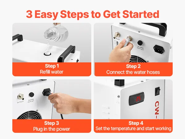 Einfache Installation: Dank standardmäßiger Ein- und Auslassgrößen ist dieser Industriewasserkühler mit den meisten Graviermaschinen, Lasersystemen und CNC-Maschinen kompatibel. Ein Luftfahrtanschluss für leckagefreie Verbindung ist im Lieferumfang enthalten