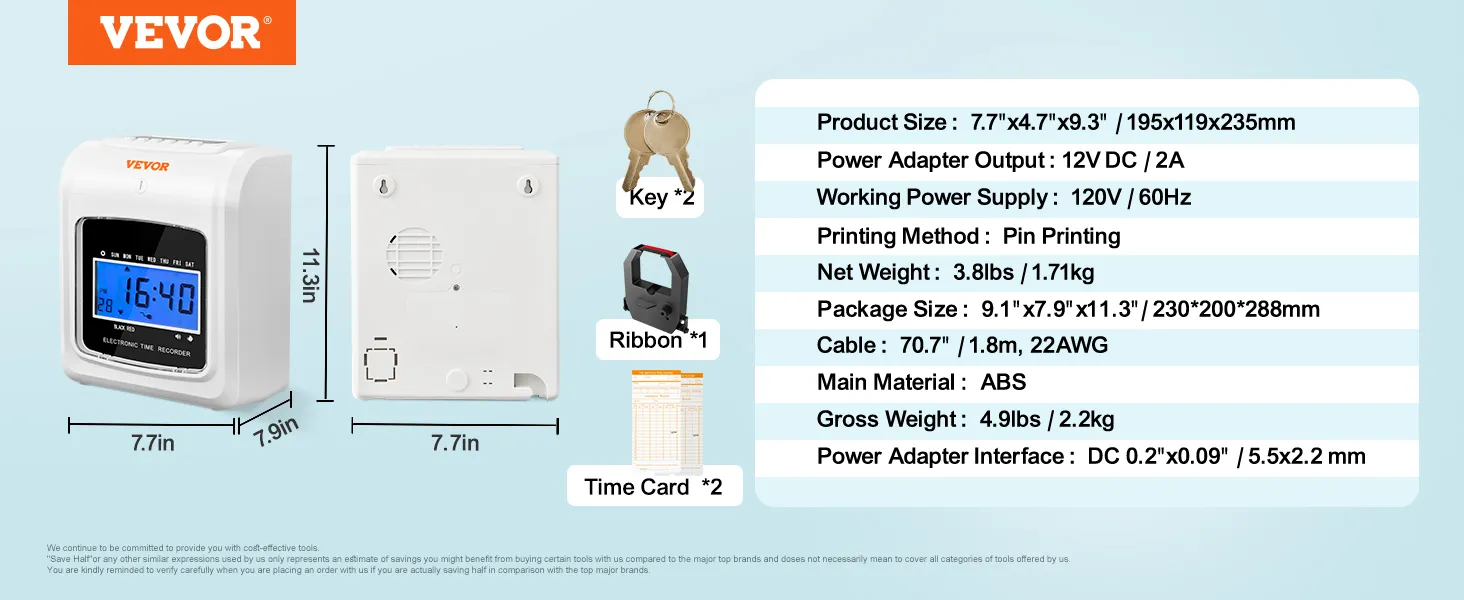 VEVOR Stempeluhr Stechuhr Zeiterfassung 52 Stempelkarten, Elektronisches Stempeluhr inkl. 2 Schlüssel + Farbband, Weiße Elektronische Stechuhr für Kleinbetriebe, Büros, Fabriken, Schulen usw. VEVOR Stempeluhr Stechuhr Zeiterfassung 52 Stempelkarten, Elektronisches Stempeluhr inkl. 2 Schlüssel + Farbband, Weiße Elektronische Stechuhr für Kleinbetriebe, Büros, Fabriken, Schulen usw.
