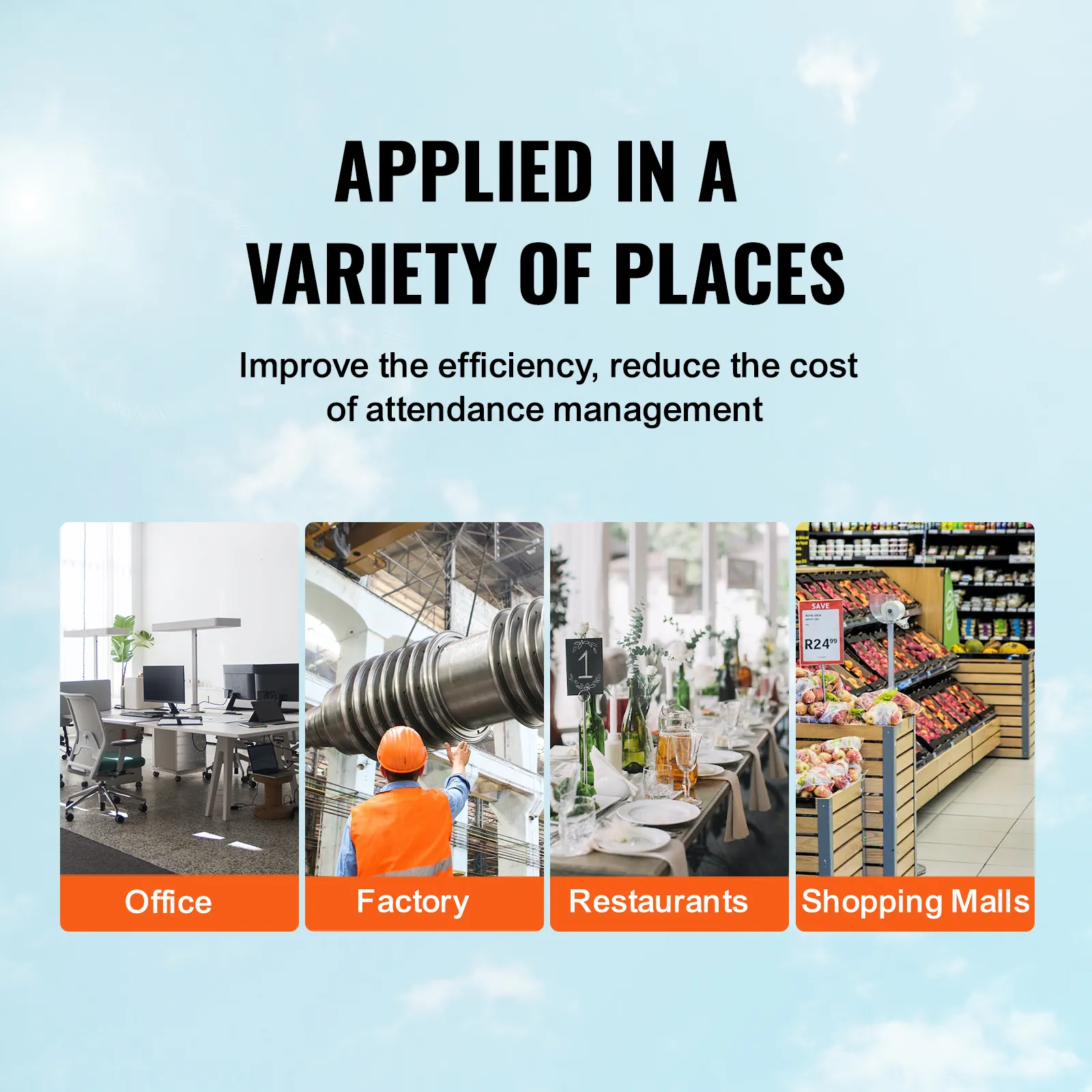 Unsere Zeiterfassungsmaschine kann an verschiedenen Orten eingesetzt werden, z. B. in Büros, Fabriken, Restaurants, Einkaufszentren und Krankenhäusern. Es ist eine kostengünstige Möglichkeit, die Effizienz des Anwesenheitsmanagements zu verbessern.