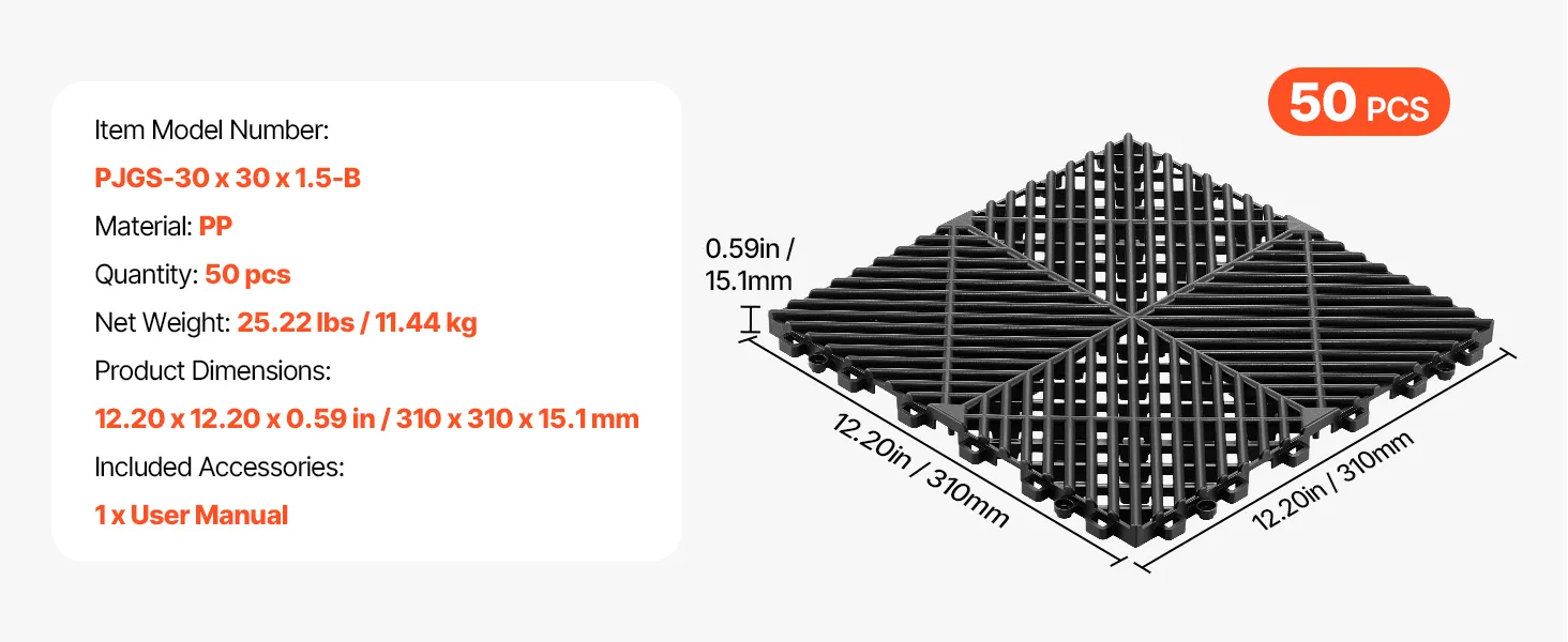 VEVOR Ineinandergreifende Drainagematten (50-tlg.) 31 x 31 cm, Garagenbodenfliesen Rutschfeste Klickfliesen aus PP, Modularer Garagenboden für Bad Küche Pool Außenbereich, Selbstentwässernd, Schwarz