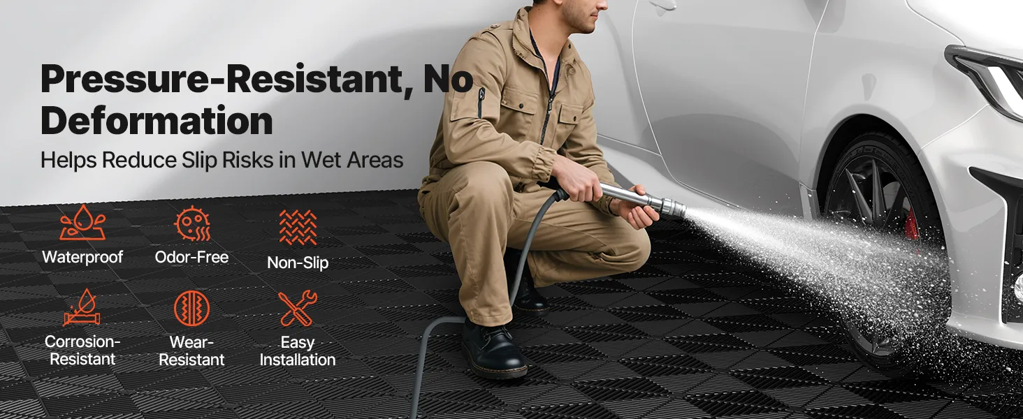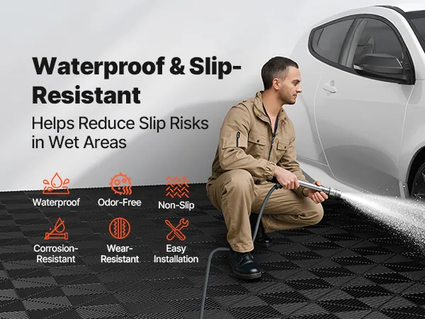 Diese modulare Garagenbodenfliese mit rutschfester Oberfläche erhöht die Griffigkeit in nassen Bereichen und trägt so zur Verringerung der Rutschgefahr bei.