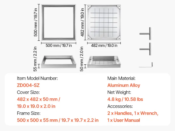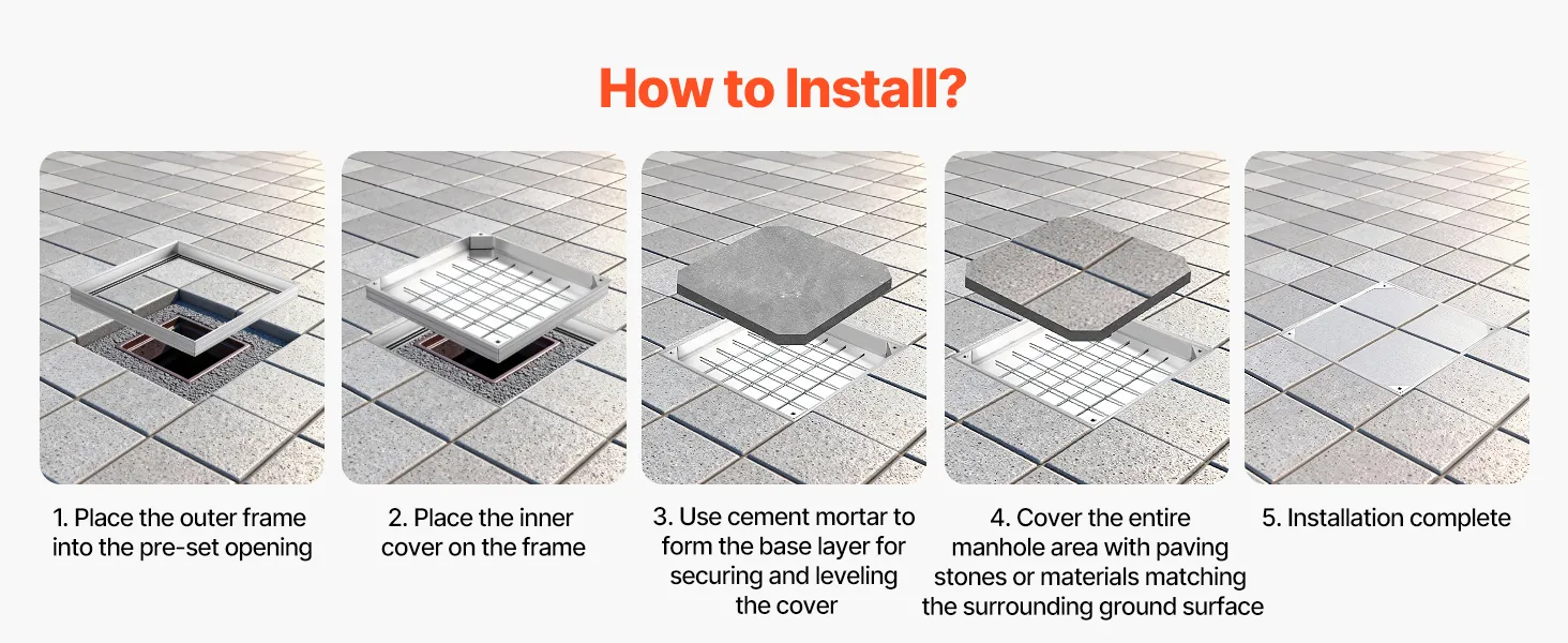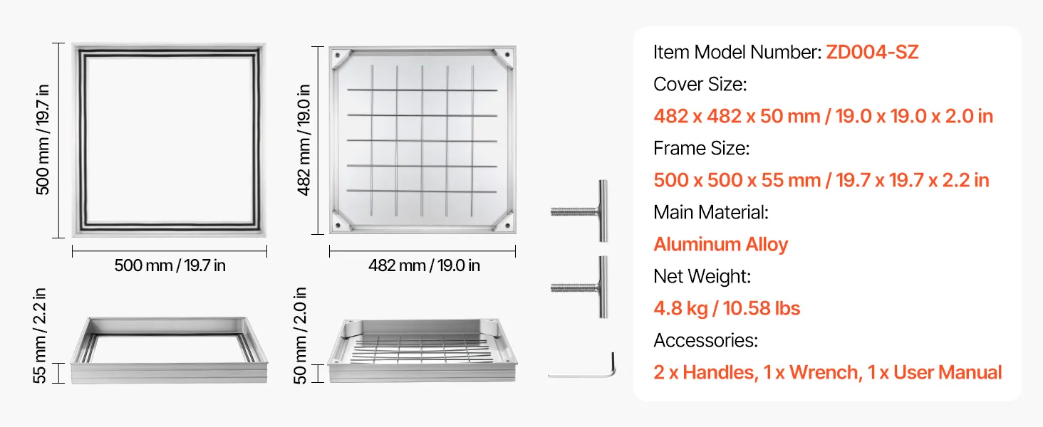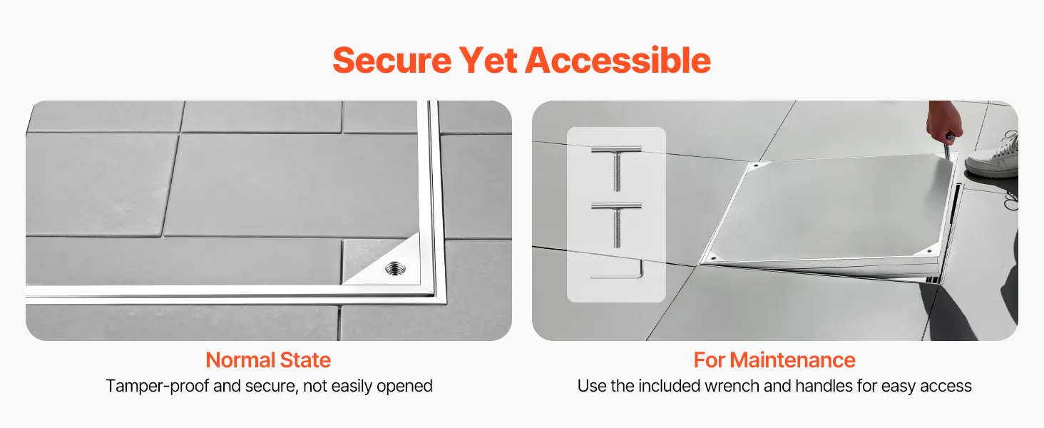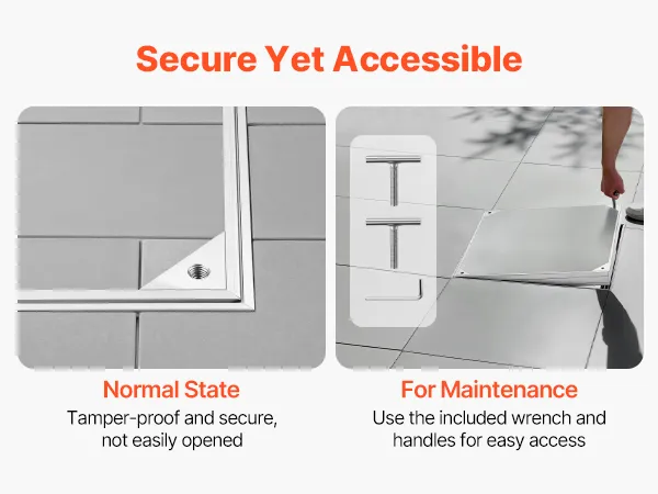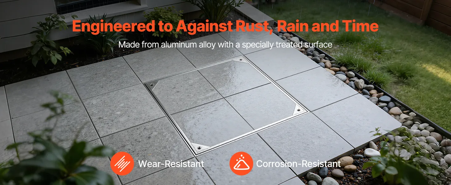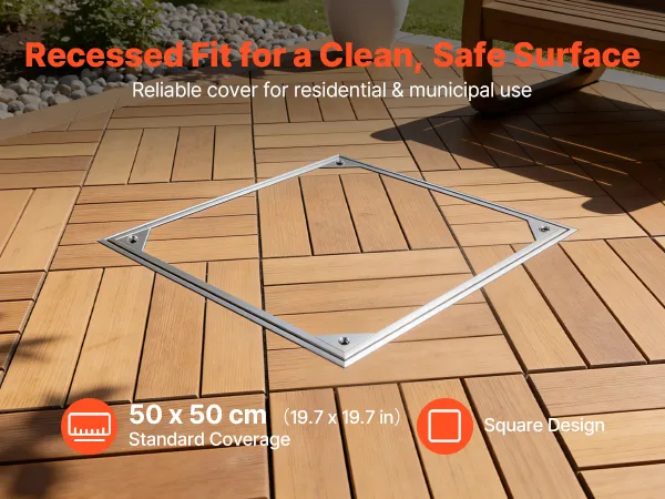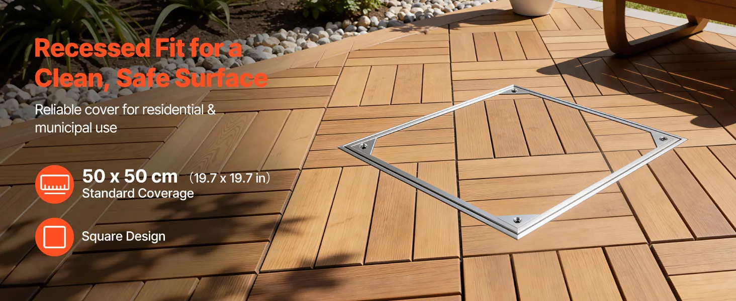 • Unsichtbares & eingelassenes Design: Rahmengröße: 19,7 x 19,7 Zoll (500 x 500 mm); Deckelgröße: 19 x 19 Zoll (482 x 482 mm). Dieser eingelassene Schachtdeckel mit Rahmen schließt bündig mit den umliegenden Fliesen oder dem Pflaster ab und schafft so einen verdeckten Zugang, der Stolperfallen reduziert und die Optik von Terrassen aufwertet