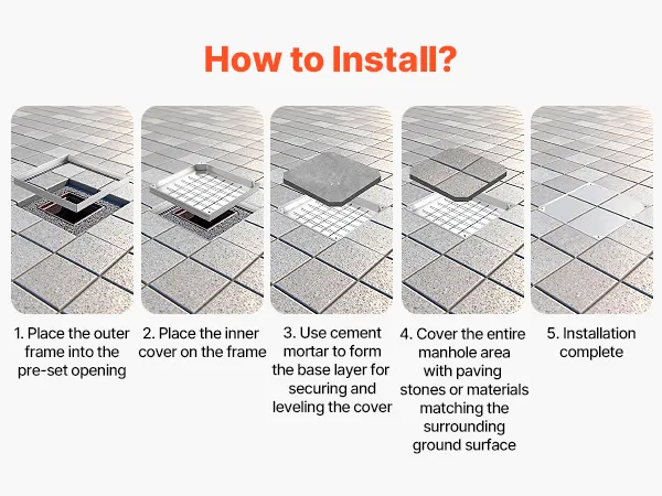 Mit wenigen einfachen Schritten lassen sich der Klärgrubendeckel und der Rahmen sicher montieren, sodass sie sich nahtlos in die umgebende Oberfläche einfügen.