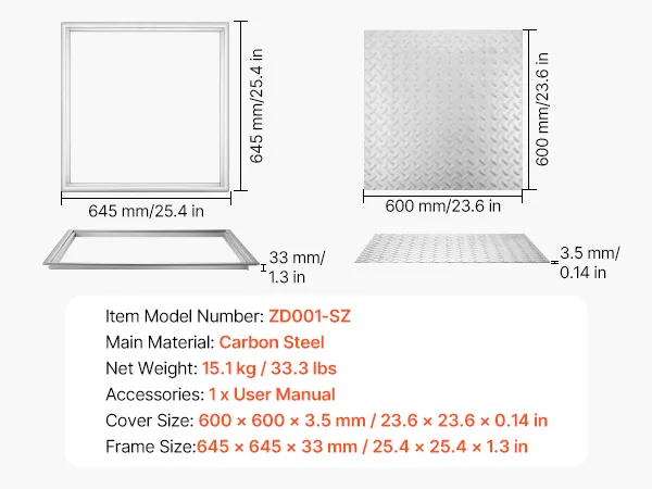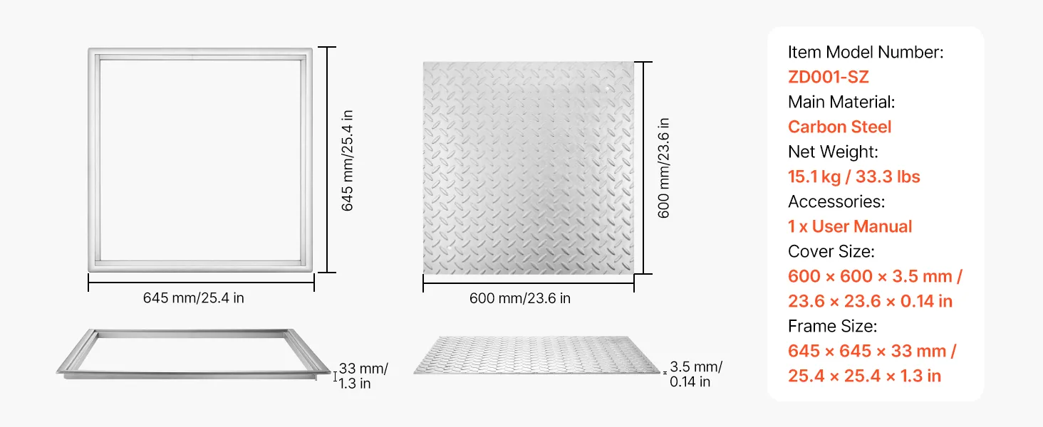 Robuste Ausführung: Schachtdeckelgröße: 23,6 x 23,6 Zoll (60 x 60 cm), Rahmengröße: 25,4 x 25,4 Zoll (645 x 645 mm). Dieser Schachtdeckel mit Rahmen bietet Standardabdeckung für Inspektionsöffnungen und zeichnet sich durch seine solide Konstruktion aus, die eine sichere Installation und langfristige Stabilität gewährleistet