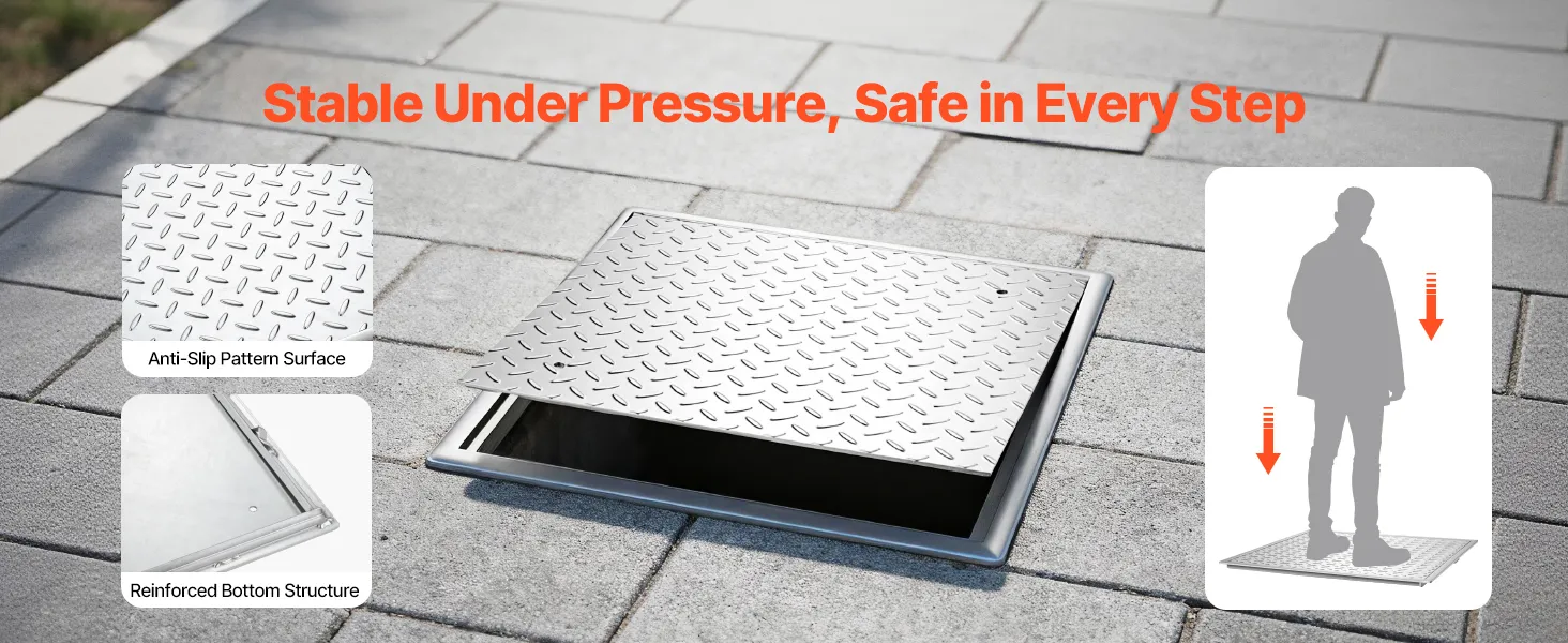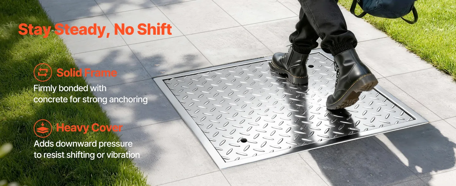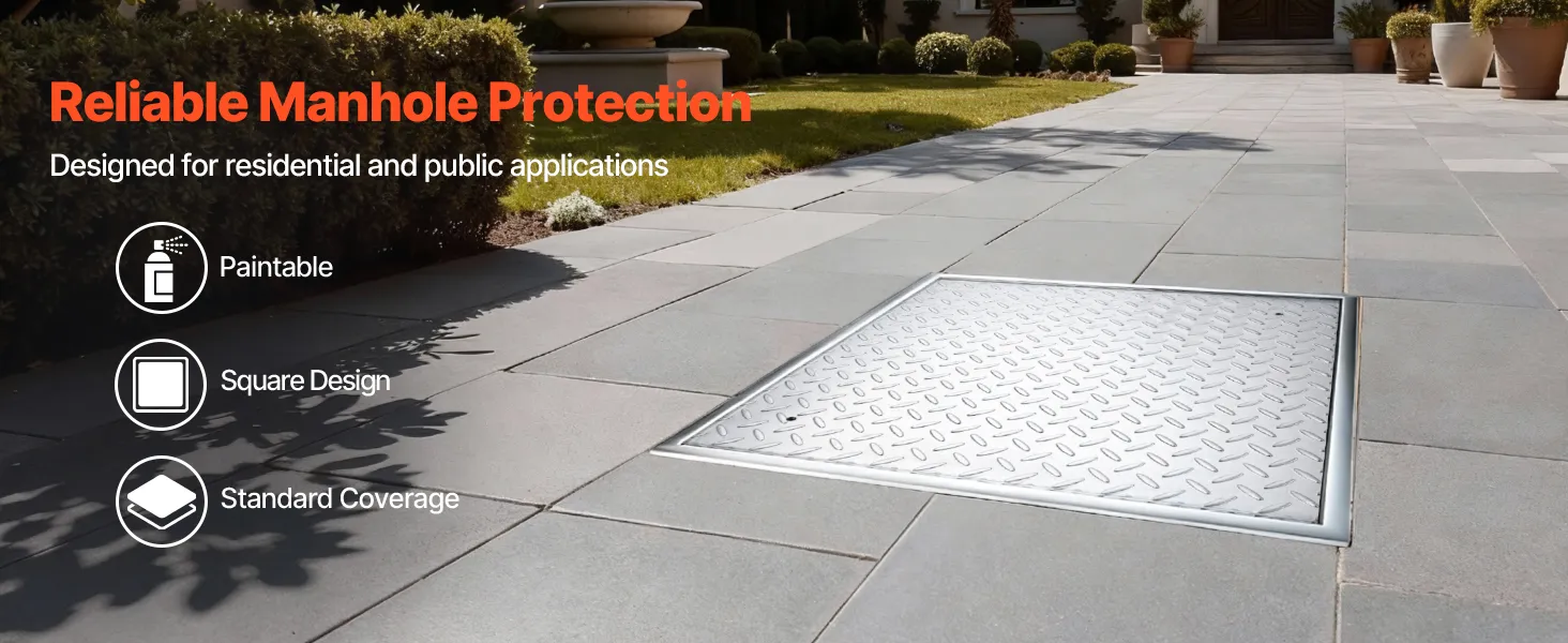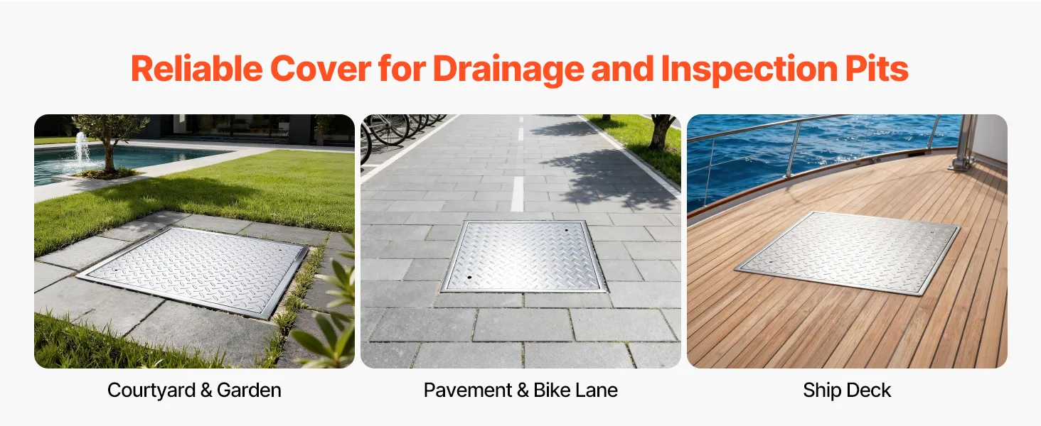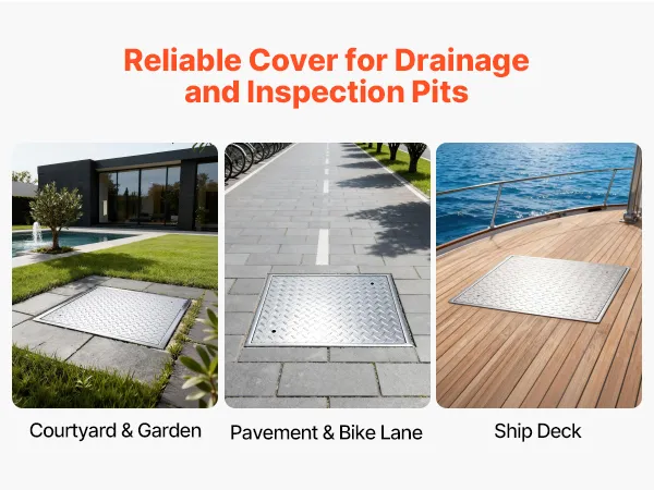 Vielseitig einsetzbar: geeignet für Gehwege im Wohnbereich, Gärten, Innenhöfe und kommunale Infrastrukturprojekte, die eine zuverlässige Schachtabdeckung erfordern. Es ist die ideale Lösung für Inspektionsschächte, Entwässerungskanäle und verschiedene Versorgungszugänge