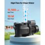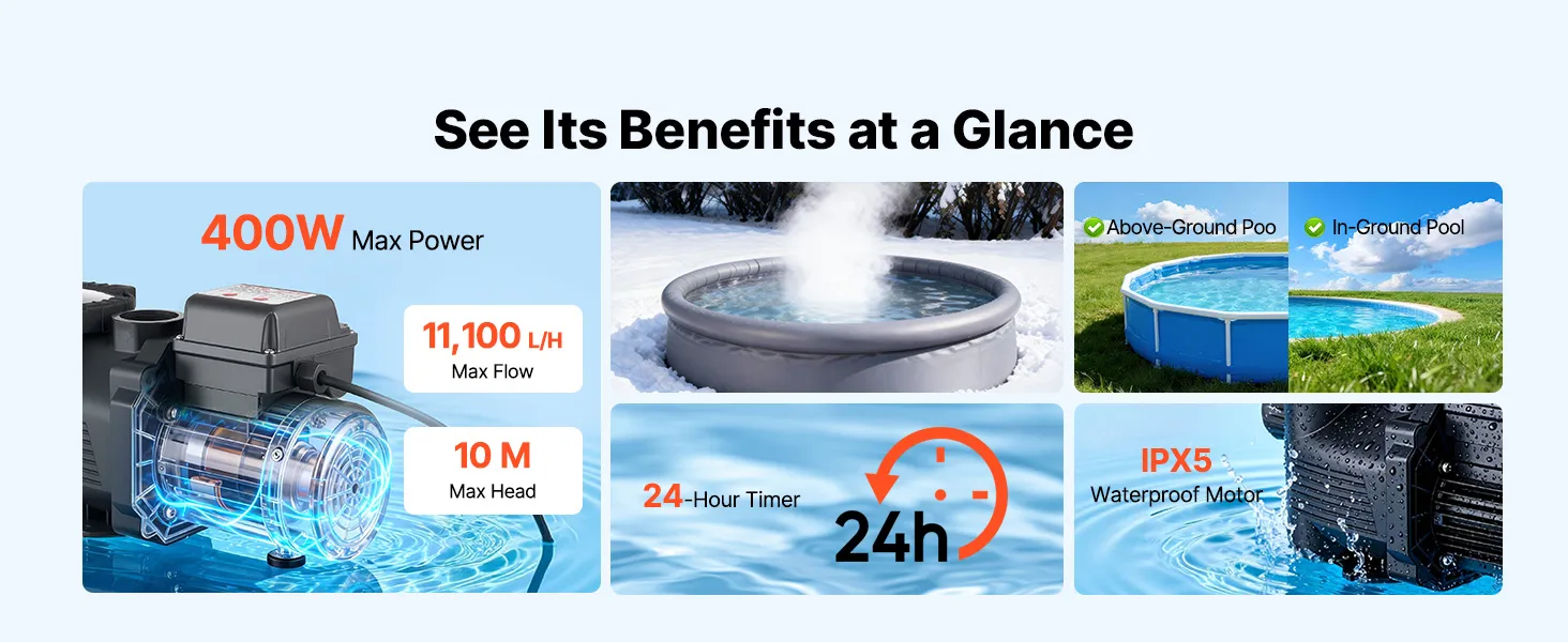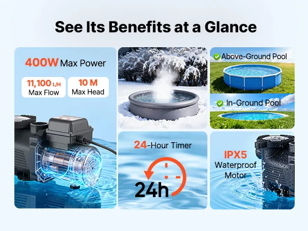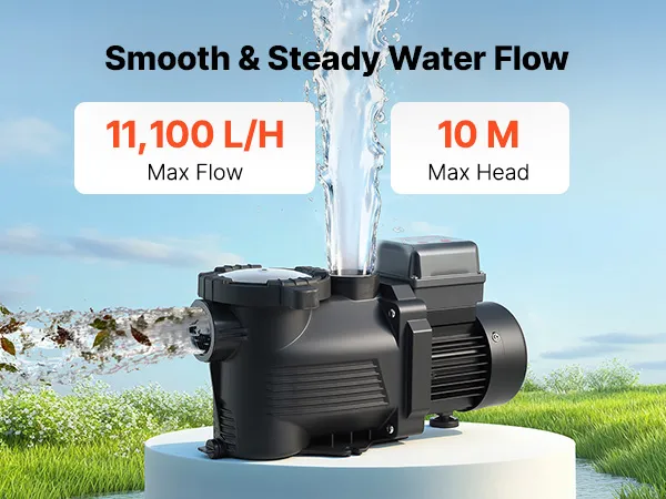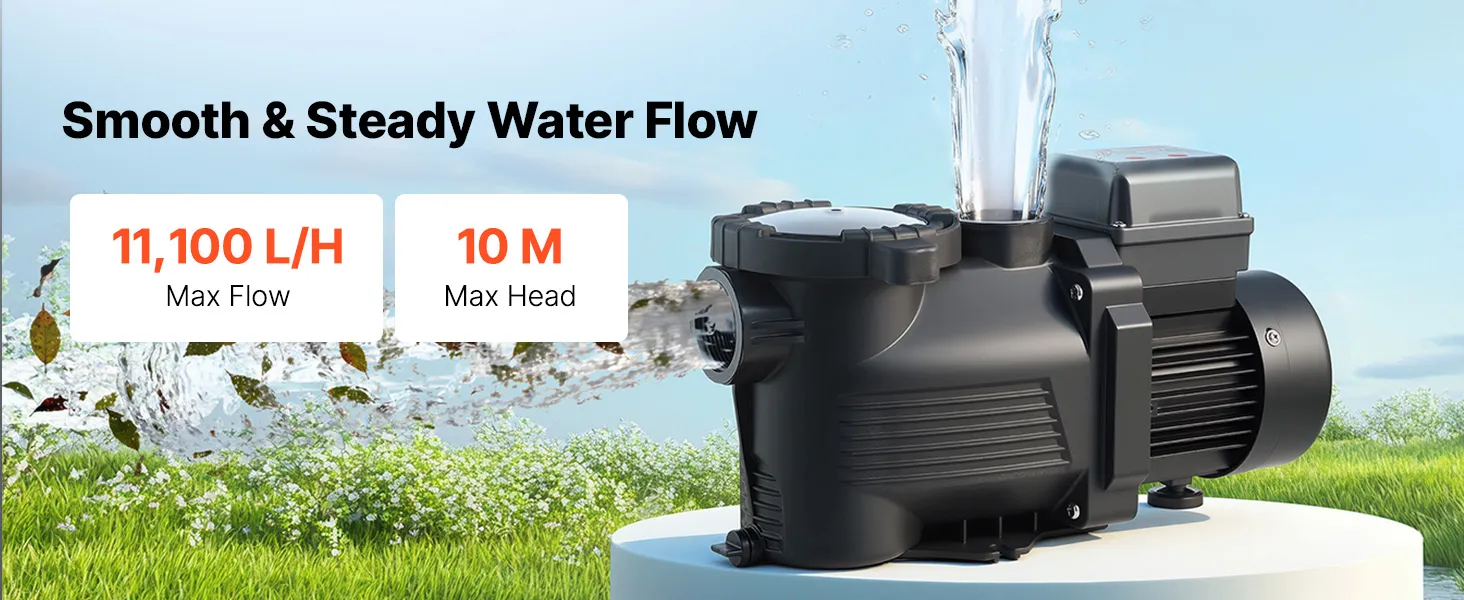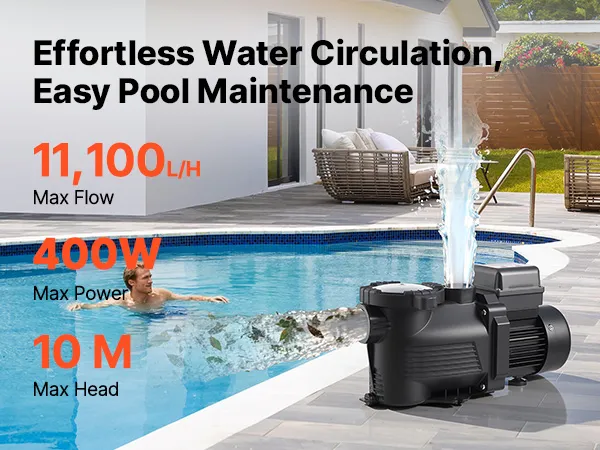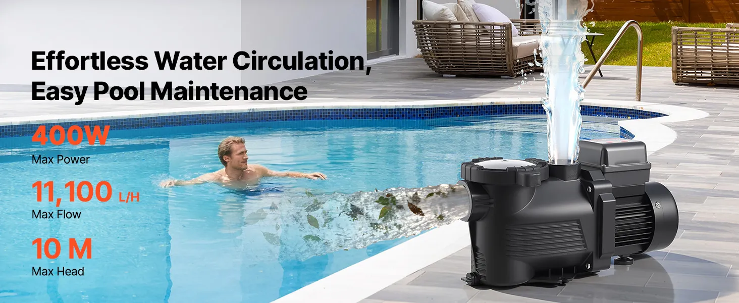 Leistungsstarke 400-W-Poolpumpe: Diese Poolpumpe verfügt über einen Kupfermotor für einen stabilen, leistungsstarken und leisen Betrieb. Mit einer max. Fördermenge von 11.100 L/H und einer max. Förderhöhe von 10 m sorgt sie für eine effiziente Wasserzirkulation und damit für ein sauberes Badeerlebnis