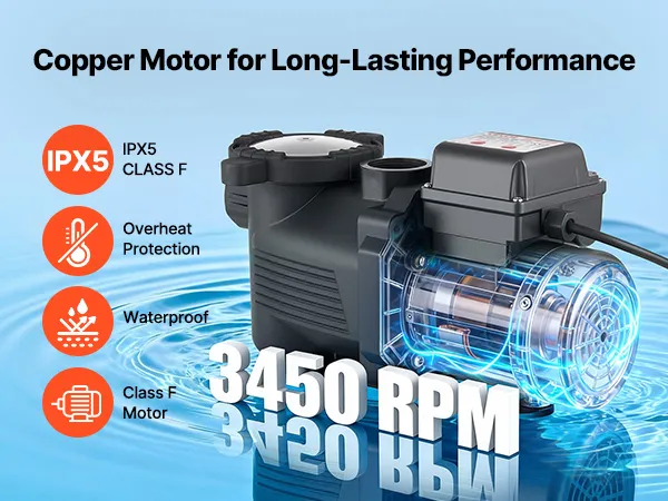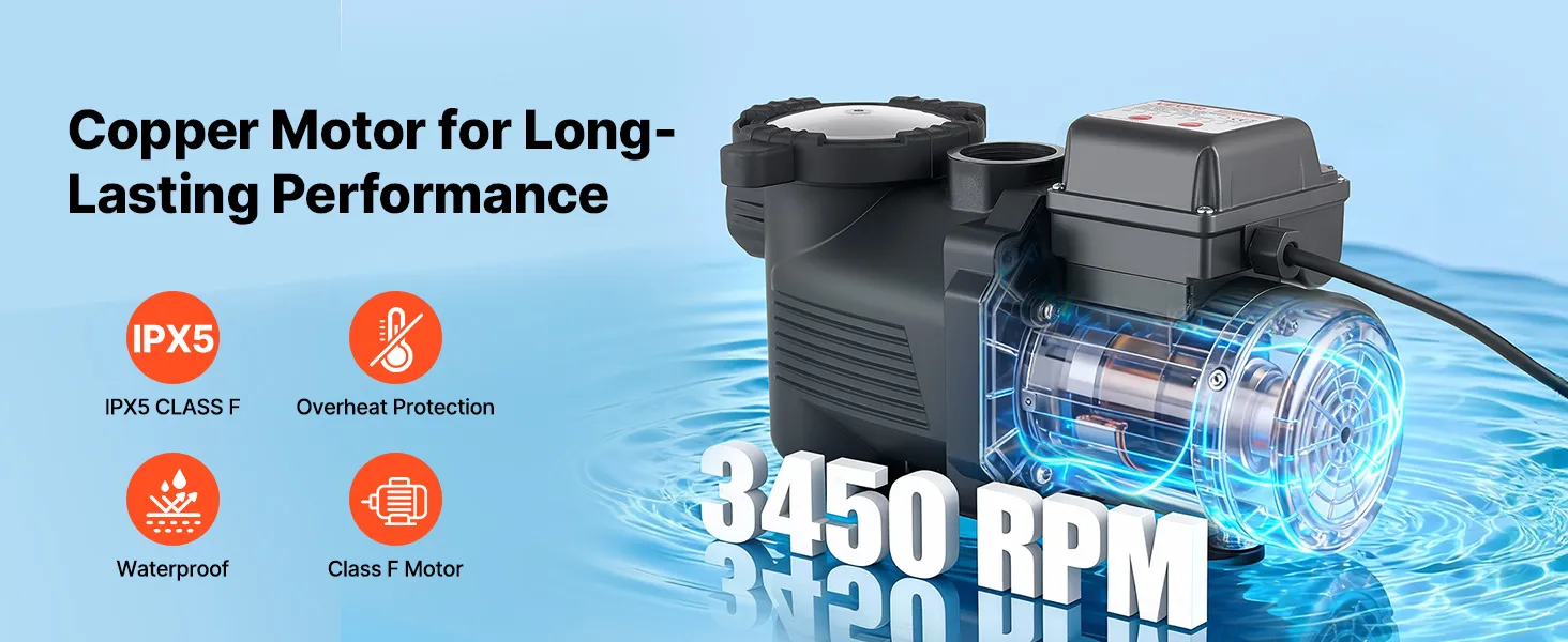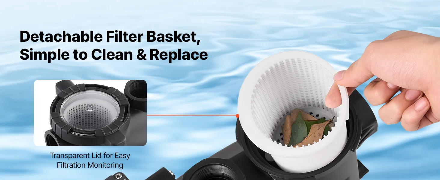 Mehrschichtiger Schutz: Ausgestattet mit einem großen Filterkorb zur Vorfilterung von Schmutzpartikeln und verlängerten Reinigungsintervallen. Diese Poolpumpe verfügt über ein verstärktes thermoplastisches Gehäuse sowie eine IPX5-Wasserdichtigkeit und einen Motor der Klasse F für zuverlässigen Betrieb