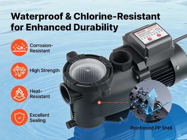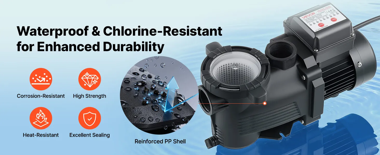 Unsere Poolfilterpumpe ist aus robustem, korrosionsbeständigem Material gefertigt und vereint Stärke, geringes Gewicht und lange Lebensdauer, um auch rauen Poolumgebungen standzuhalten.