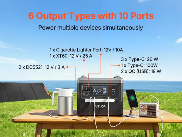 Mit 6 Ausgangstypen und 10 Anschlüssen kann diese Solarstromanlage mehrere Geräte gleichzeitig problemlos mit Strom versorgen.
