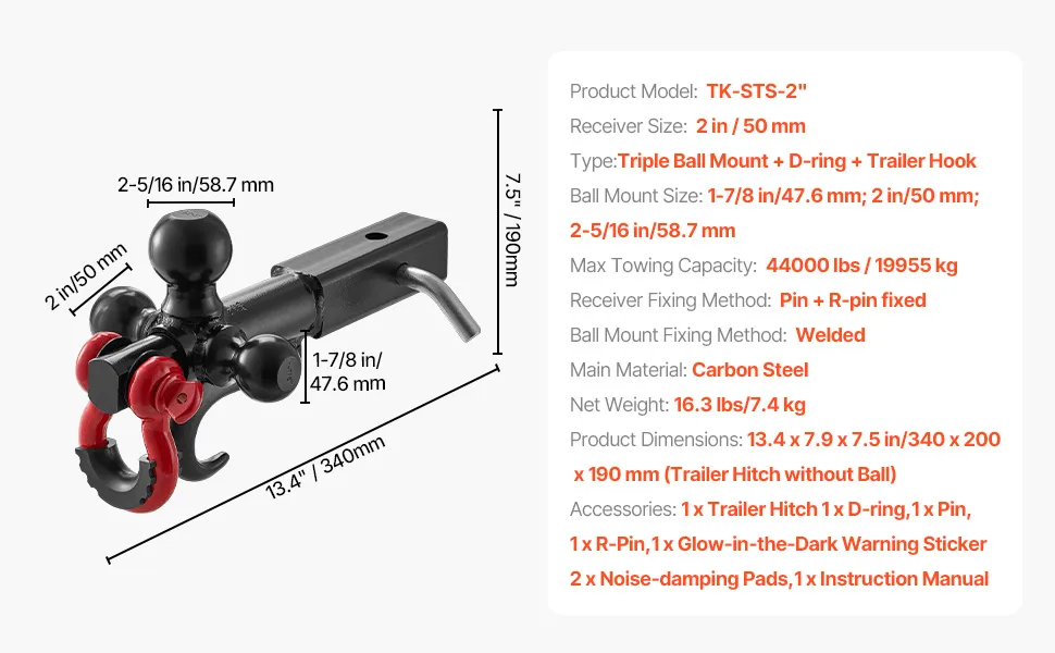 VEVOR Anhängerkupplung, Kugelkopfhalterung mit Haken und D-Ring, passend für 50-mm-Empfänger, mit 47,6/50/58,7-mm-Kugeln, 19.955 kg Tragkraft, für Wohnmobil, SUV, ATV, LKW, schwarz